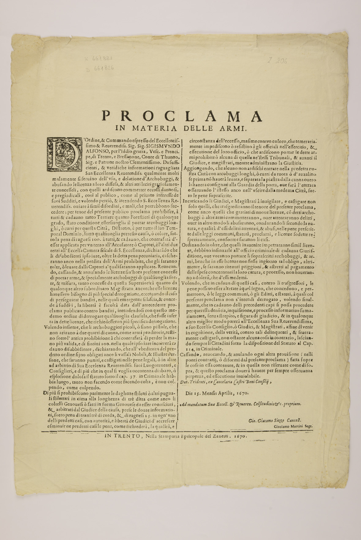 Proclama sulle armi emanato il 15 aprile 1670 da Sigismondo Alfonso Thun, principe-vescovo di Trento, sottoscritto da Giovanni Giacomo Sizzo e Girolamo Martini