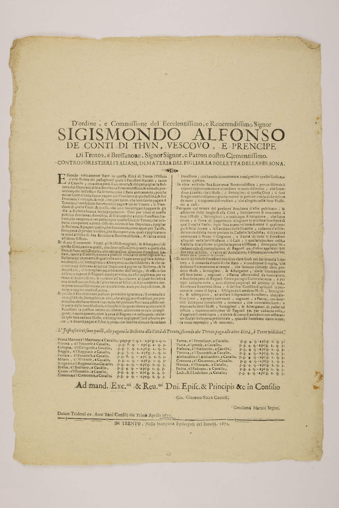 1 manifesto, carattere romano e corsivo, iniziale di corpo maggiore, fregi tipografici. Proclama sui forestieri italiani emanato il 1 aprile 1671 da Sigismondo Alfonso Thun, principe-vescovo di Trento, e sottoscritto da Giovanni Giacomo Sizzo e Girolamo Martini. Filigrana: monogramma AB con trifoglio ma assenza di contromarca.