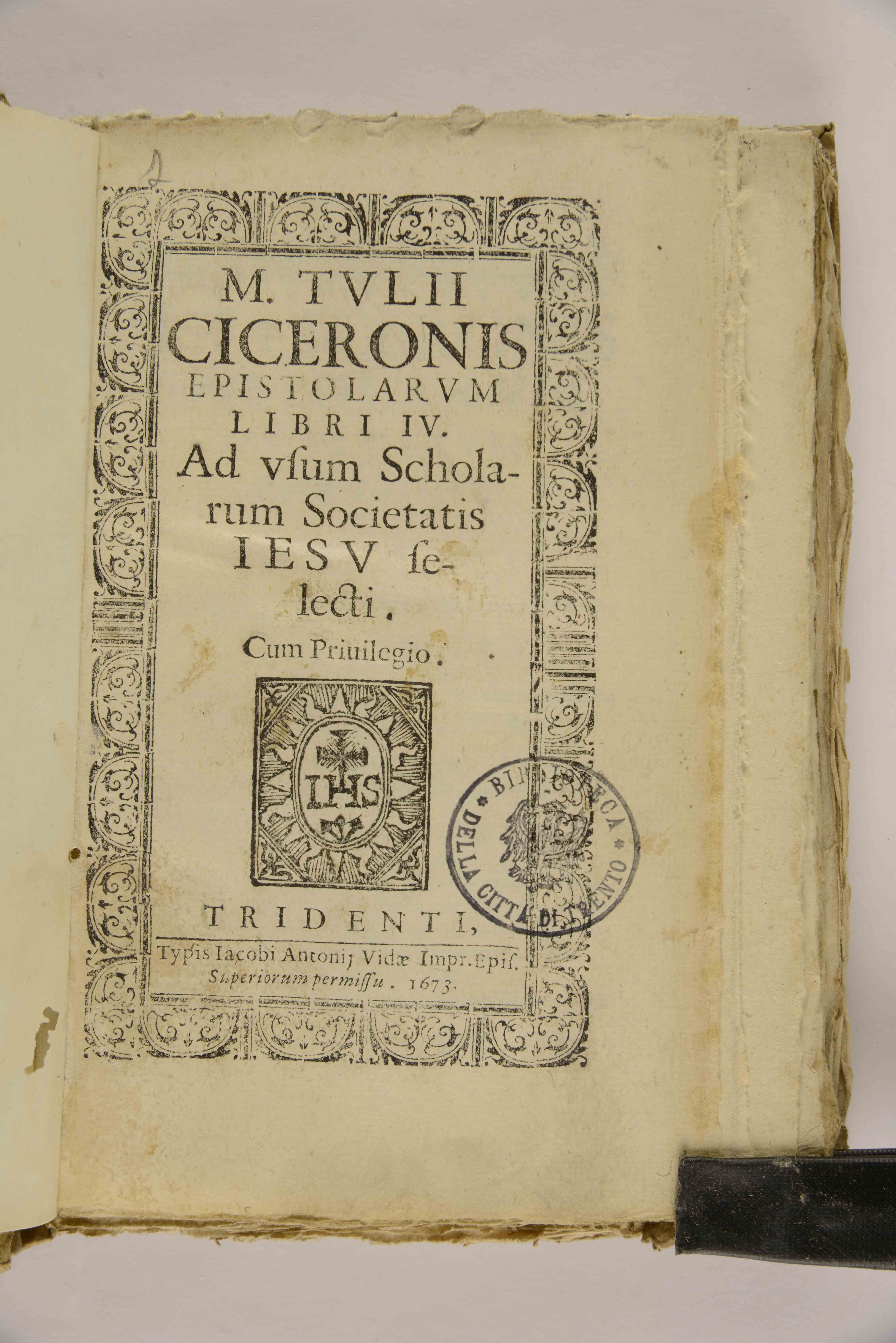 62 cc. numerate per pagina [2] 1-31 36-37 34-35 32-33 38-55 60-61 58-59 56-57 62-98 [4], 8°: A-C16 D4 [$8 segnate (- A1, D2,3,4), c. B2 segnata B4, c. B4 segnata B2], bianca la c. A1v. Carattere romano e corsivo, frontespizio in cornice tipografica, xilografia al frontespizio, fregi tipografici alle cc. A2r e D4v, iniziali di corpo maggiore all’inizio di ciascuna lettera, titoli correnti. Licenza e privilegio. Alle cc. A2r-D2v il testo delle lettere di Cicerone, selezionate e suddivise redazionalmente in 4 libri, ciascuna lettera è preceduta dall’argomento. Alle cc. D2v-D4v alcune sentenze di Cicerone piae et cum religione christiana non male congruentes.
