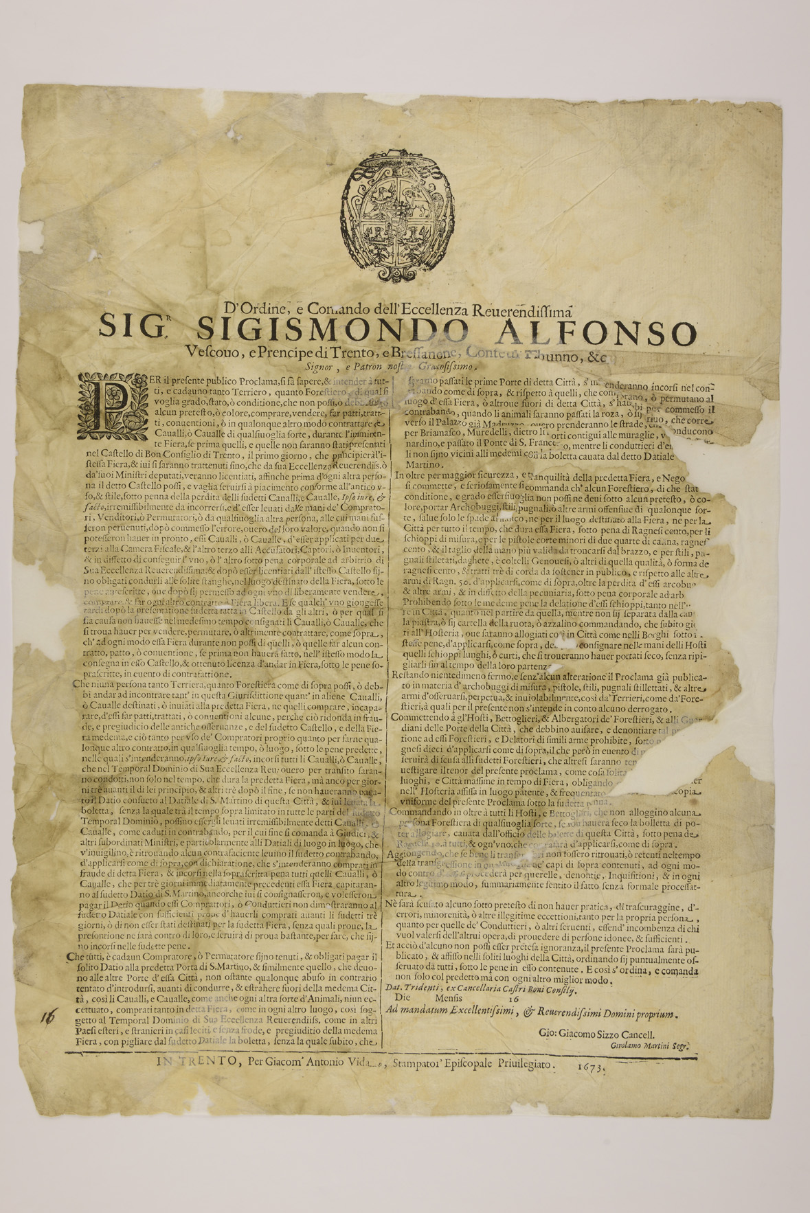 Proclama sulle fiere emanato nel 1673 da Sigismondo Alfonso Thun, principe-vescovo di Trento, e sottoscritto da Giovanni Giacomo Sizzo e Girolamo Martini, spazio in bianco per l'inserimento della data di emanazione