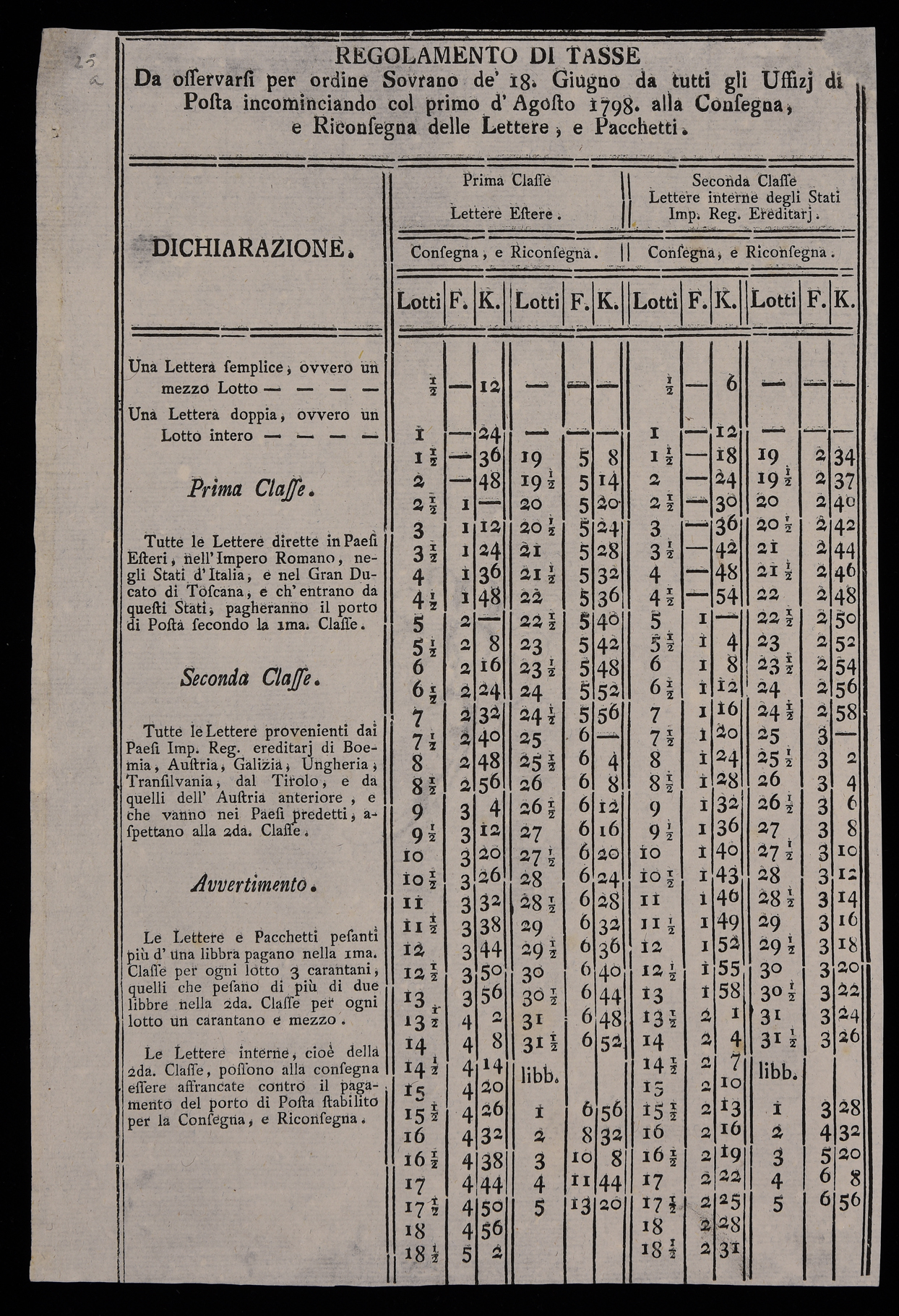 | Regolamento di tasse da osservarsi per ordine sovrano de' 18 giugno da tutti gli uffizi di posta incominciando col primo d'agosto 1798 alla consegna, e riconsegna delle lettere, e pacchetti |
