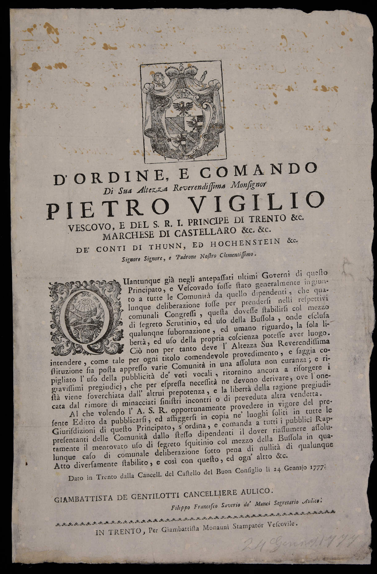 1 manifesto. Proclama sulle modalità di svolgimento dello scrutinio segreto nelle deliberazioni comunali emanato il 24 gennaio 1777 da Pietro Vigilio Thun principe-vescovo di Trento, stemma di Pietro Vigilio Thun