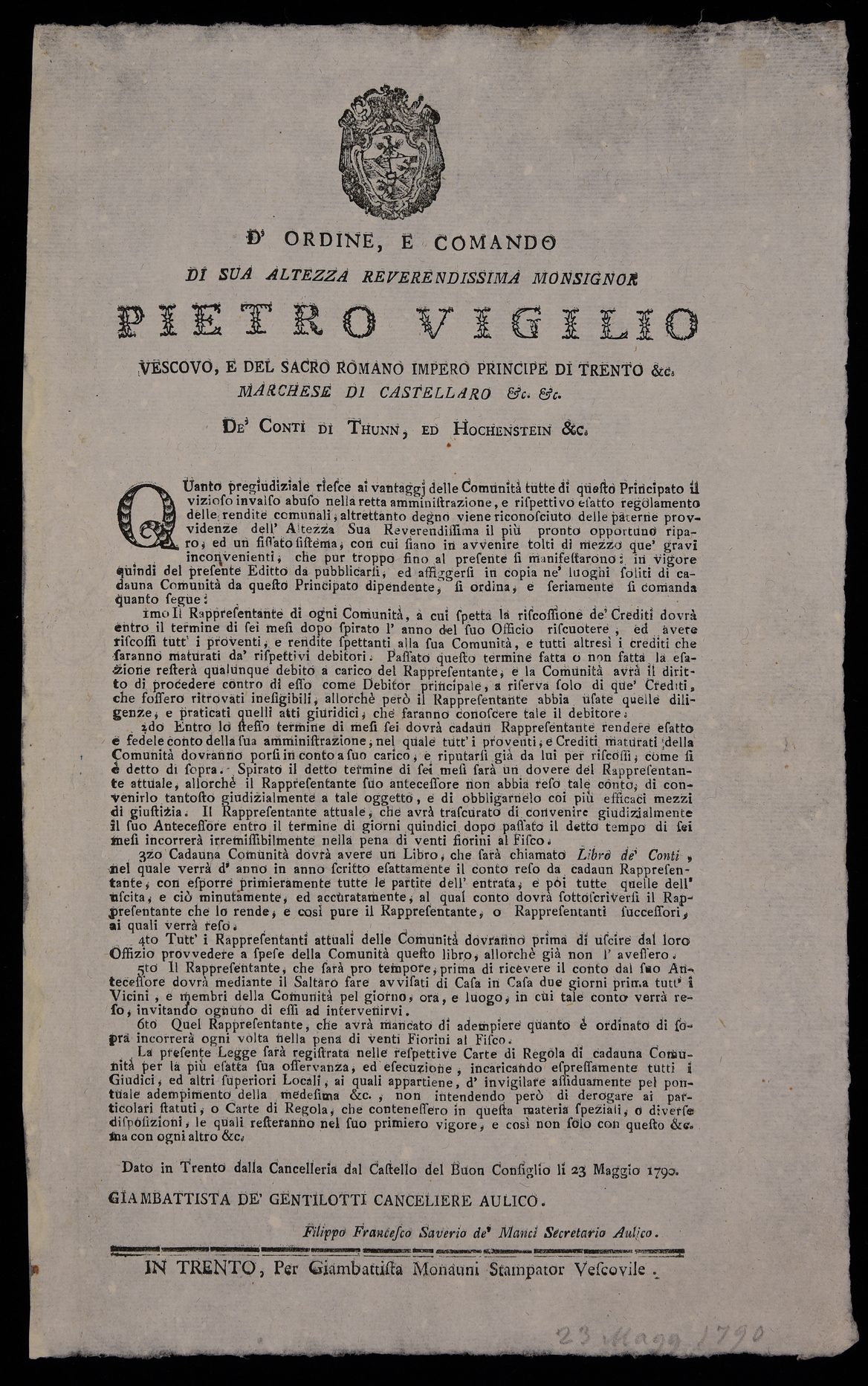 Proclama sulla finanza comunale emanato il 23 maggio 1790 da Pietro Vigilio Thun, principe-vescovo di Trento, stemma di Pietro Vigilio Thun.