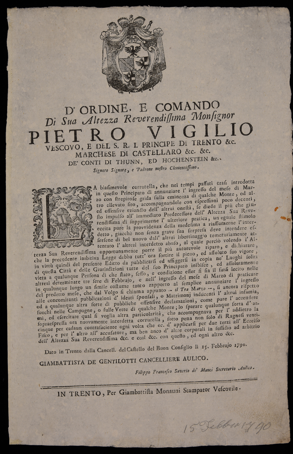 | D'ordine, e comando di sua altezza reverendissima monsignor Pietro Vigilio vescovo, e del S.R.I. principe ... |