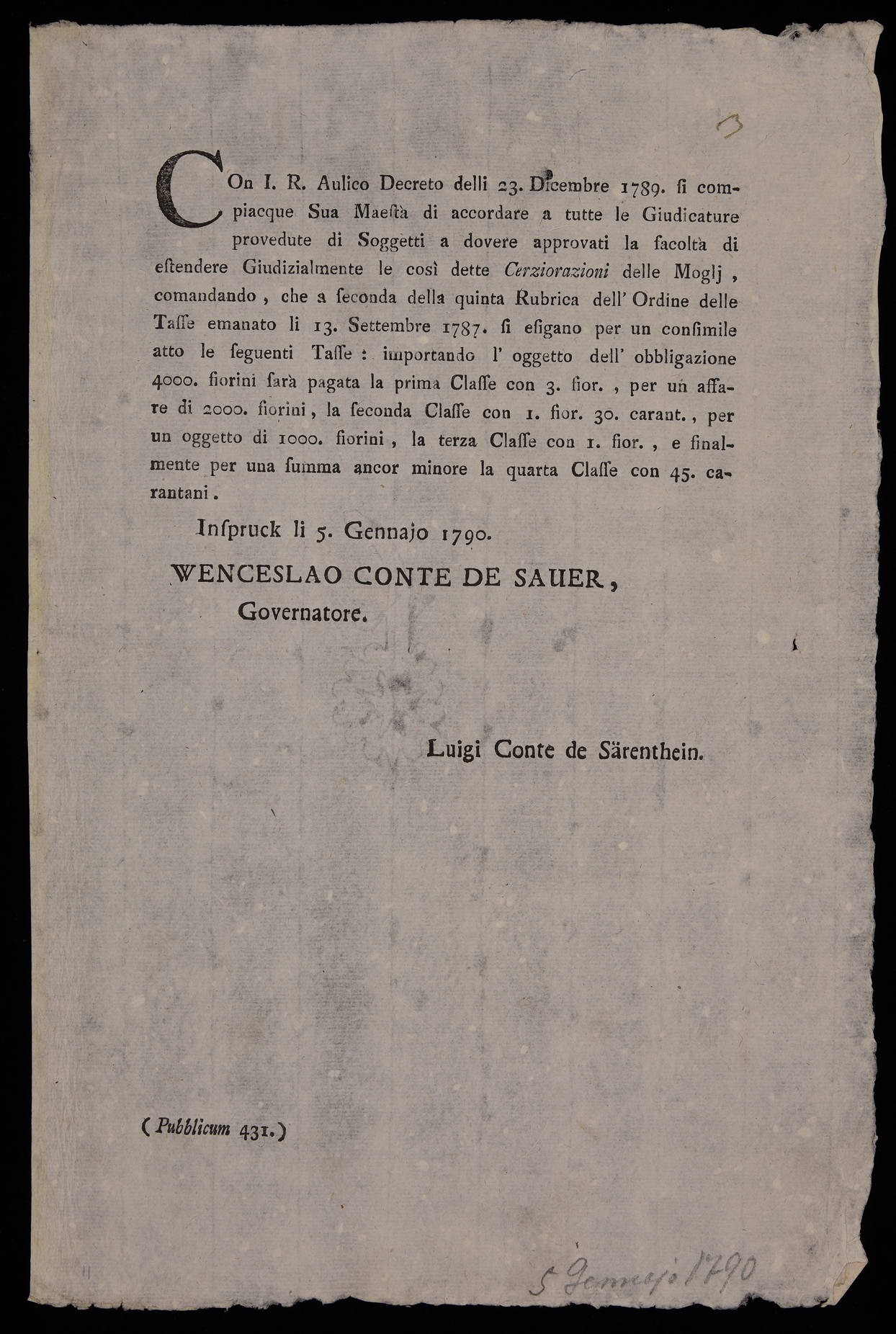 Con I.R. aulico decreto delli 23. dicembre 1789. si compiacque sua maestà...