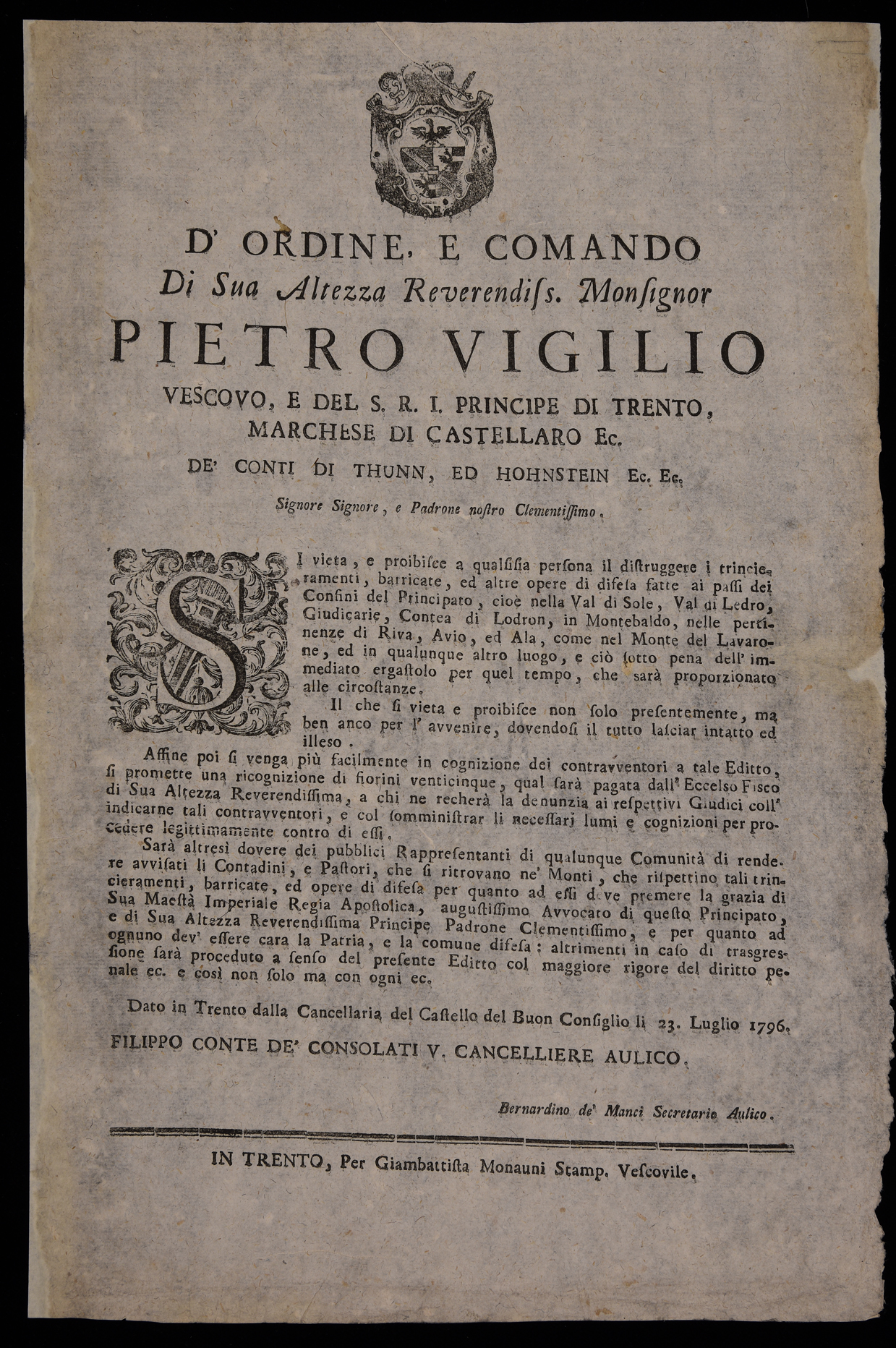 Proclama che vieta di distruggere i trinceramenti, le barricate e le altre opere di difesa emanato il 23 luglio 1796 da Pietro Vigilio Thun, principe-vescovo di Trento, stemma di Pietro Vigilio Thun.