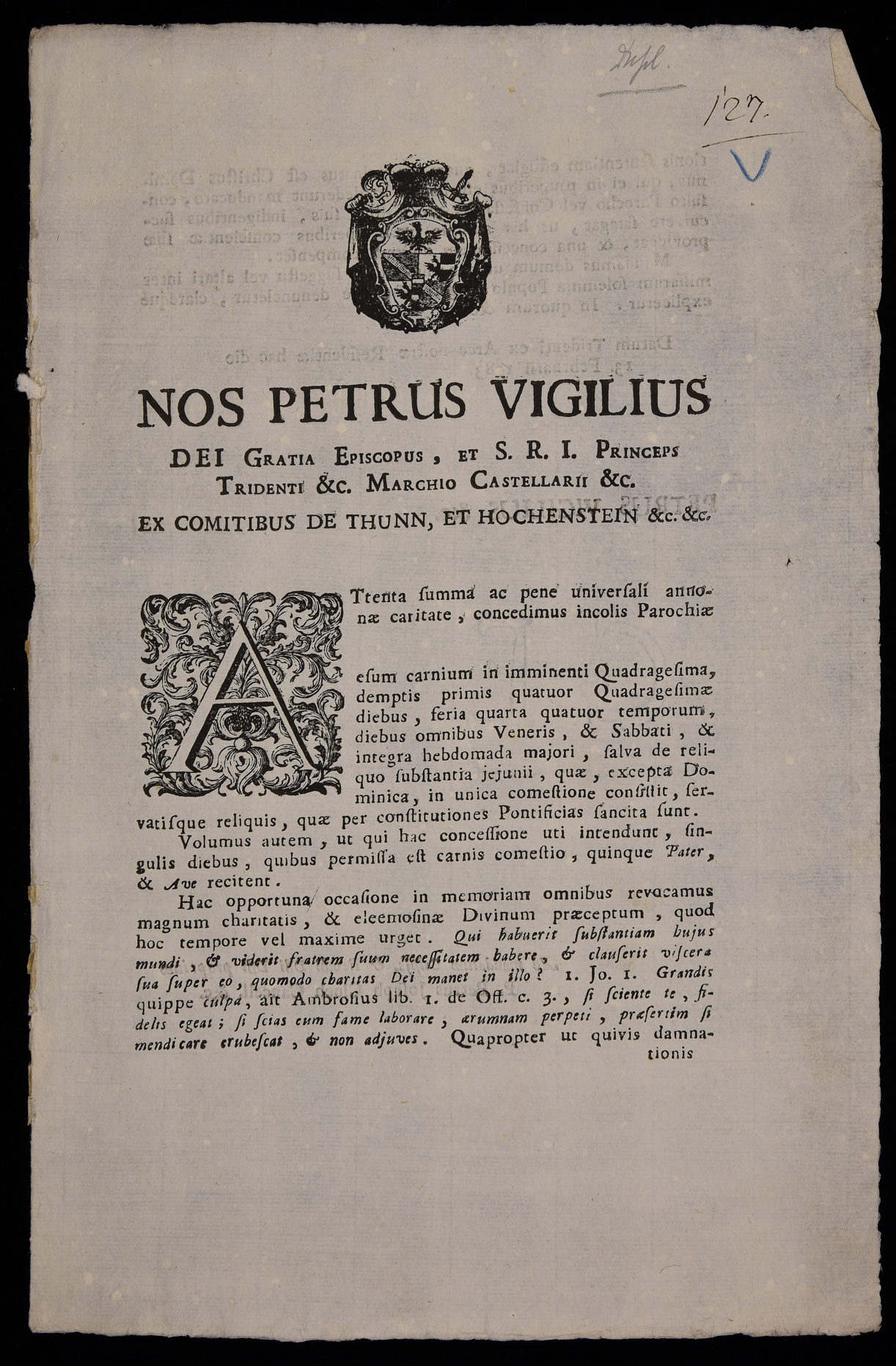 Proclama che permette di mangiar carne in quaresima ed esorta alla carità verso i bisognosi emanato il 13 febbraio 1783 da Pietro Vigilio Thun, principe-vescovo di Trento, stampa attribuibile alla tipografia Monauni di Trento in base al raffronto di caratteri e fregi, stemma di Pietro Vigilio Thun.