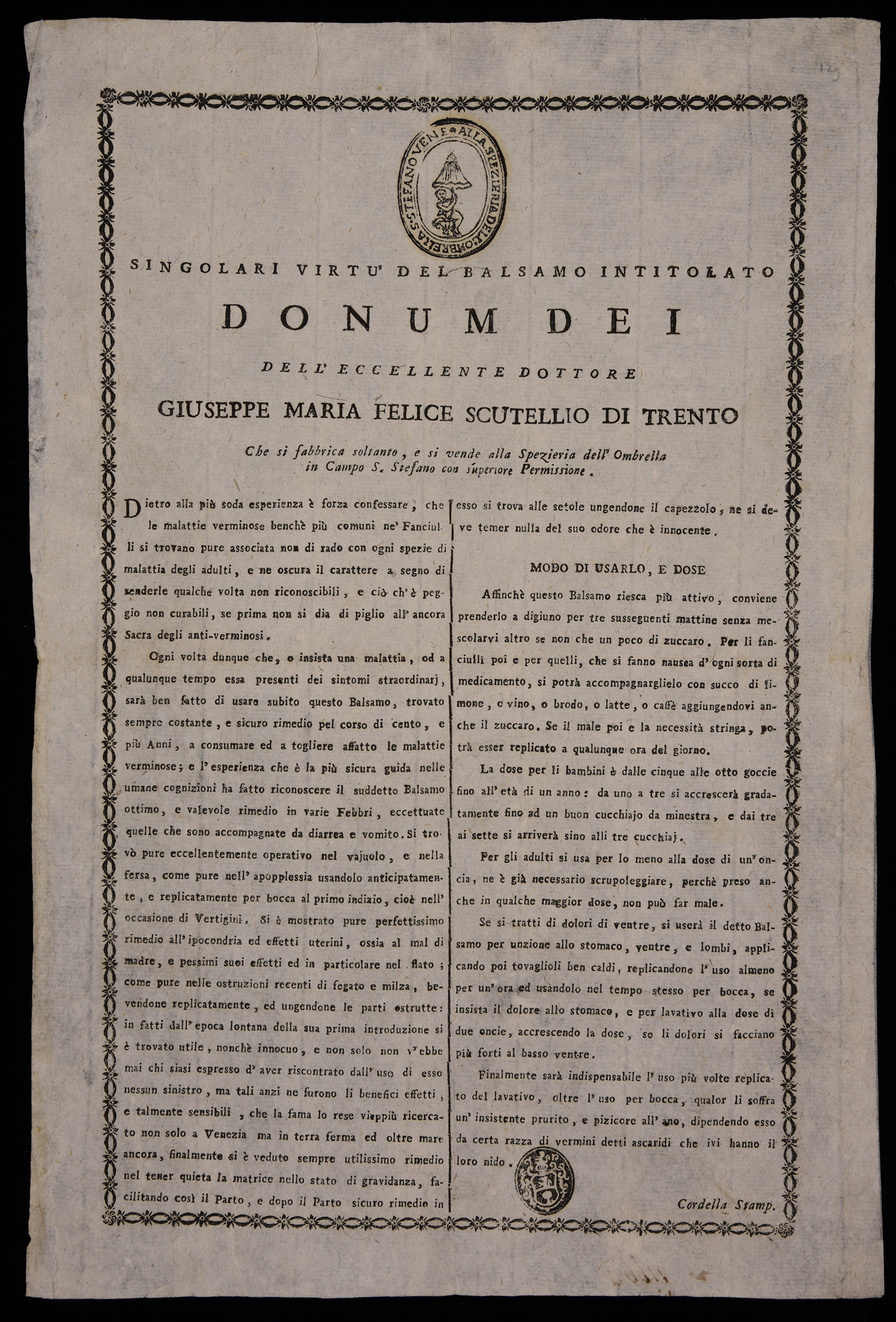 | Singolari virtù del balsamo intitolato Donum Dei dell'eccellente dottore Giuseppe Maria Felice Scutellio di Trento ... |