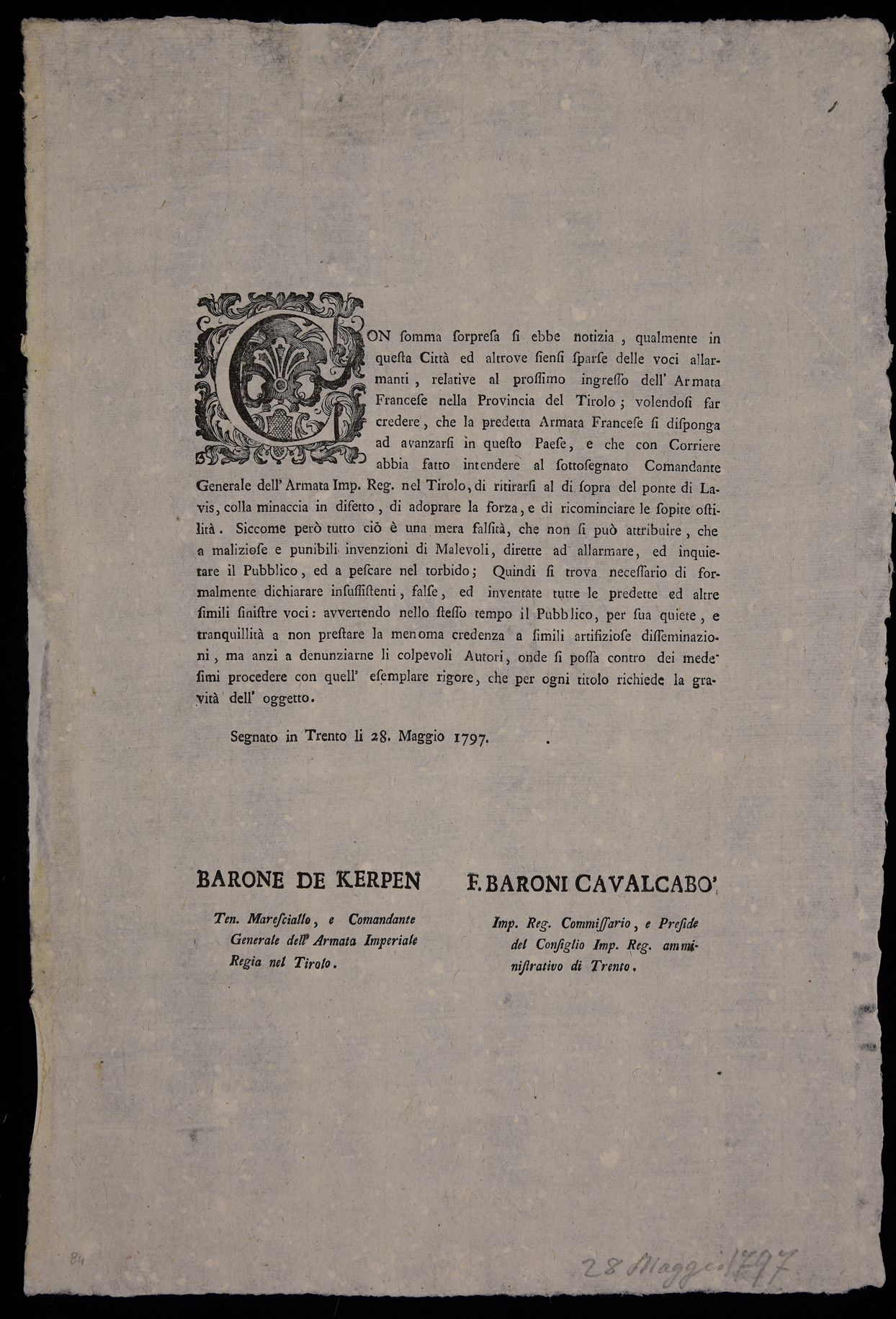 | Con somma sorpresa si ebbe notizia, qualmente in questa città ed altrove siensi sparse delle voci allarmanti, relative al prossimo ingresso dell'armata francese ... |
