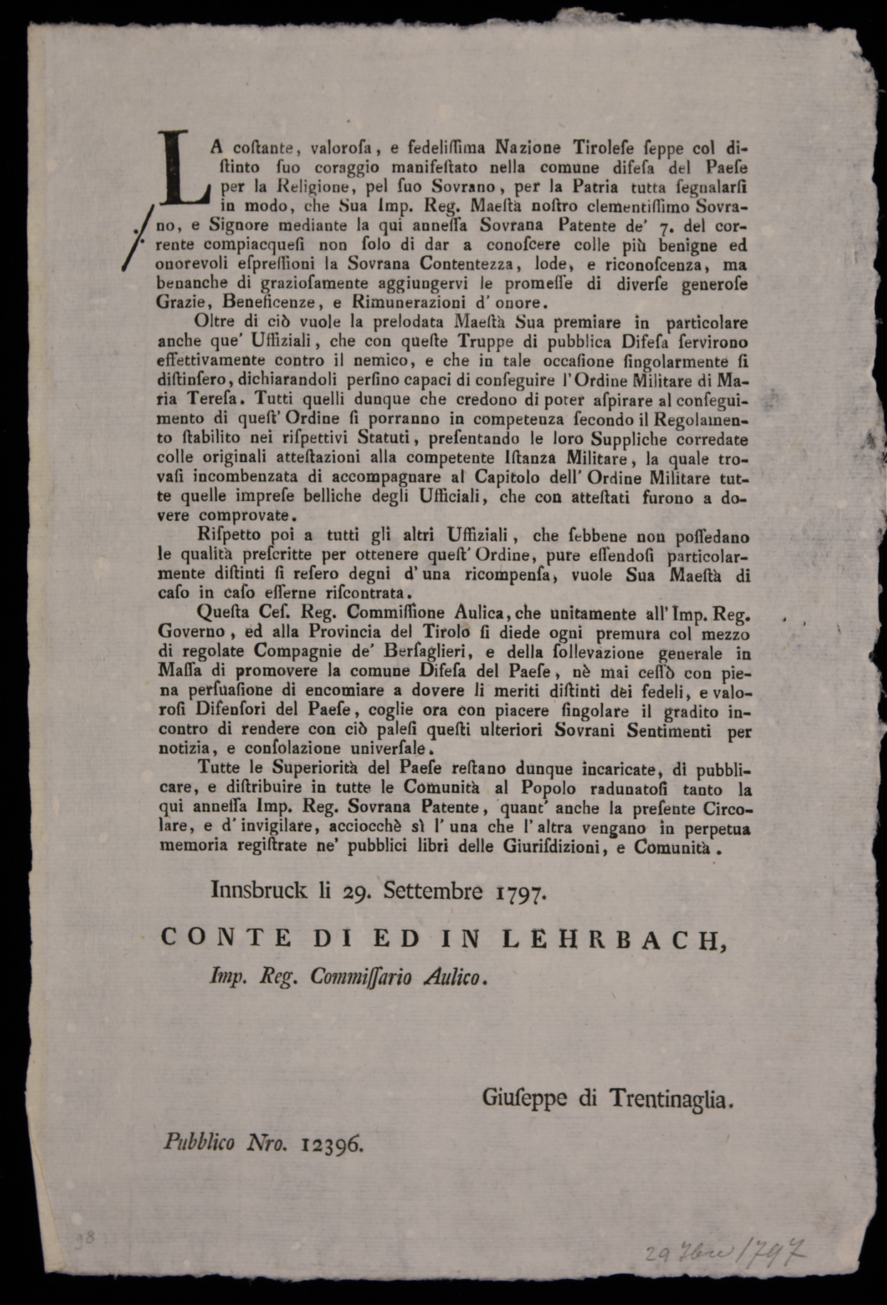 | La costante, valorosa, e fedelissima nazione tirolese seppe col distinto suo coraggio manifestato nella comune difesa del Paese per la religione ... |