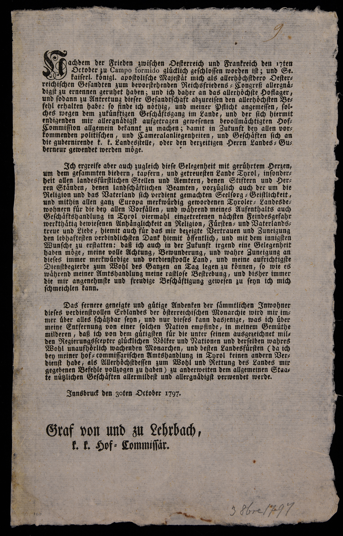 | Nachdem der Frieden zwischen Oesterreich und Frankreich den 17ten October zu Campo Formido ... |