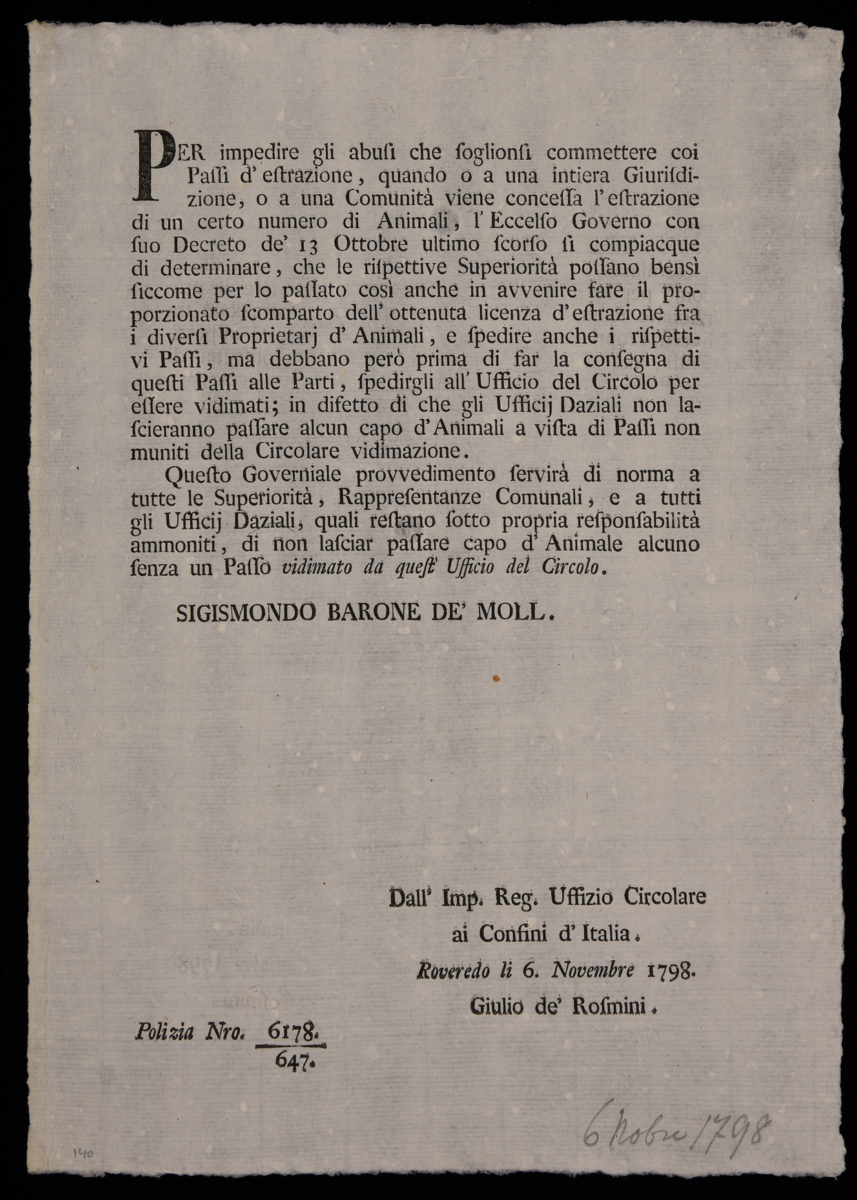 | Per impedire gli abusi che soglionsi commettere coi passi d'estrazione, quando o a una intiera giurisdizione, o a una comunità viene concessa l'estrazione di un certo numero di animali ... |