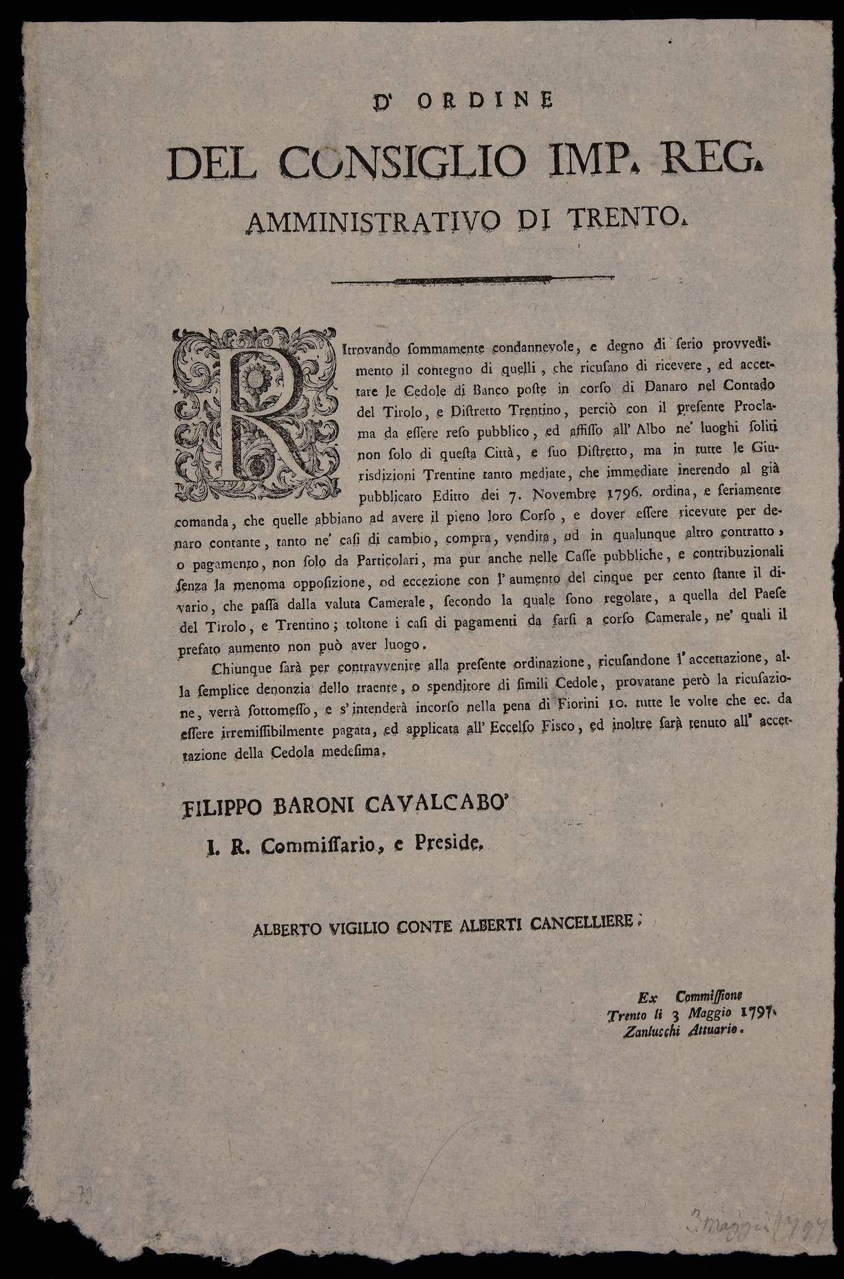 Proclama sulle cedole da banco emanato il 3 maggio 1797 dall’Imperial regio consiglio amministrativo di Trento, stampa attribuibile alla tipografia Monauni di Trento in base al raffronto di caratteri e fregi.