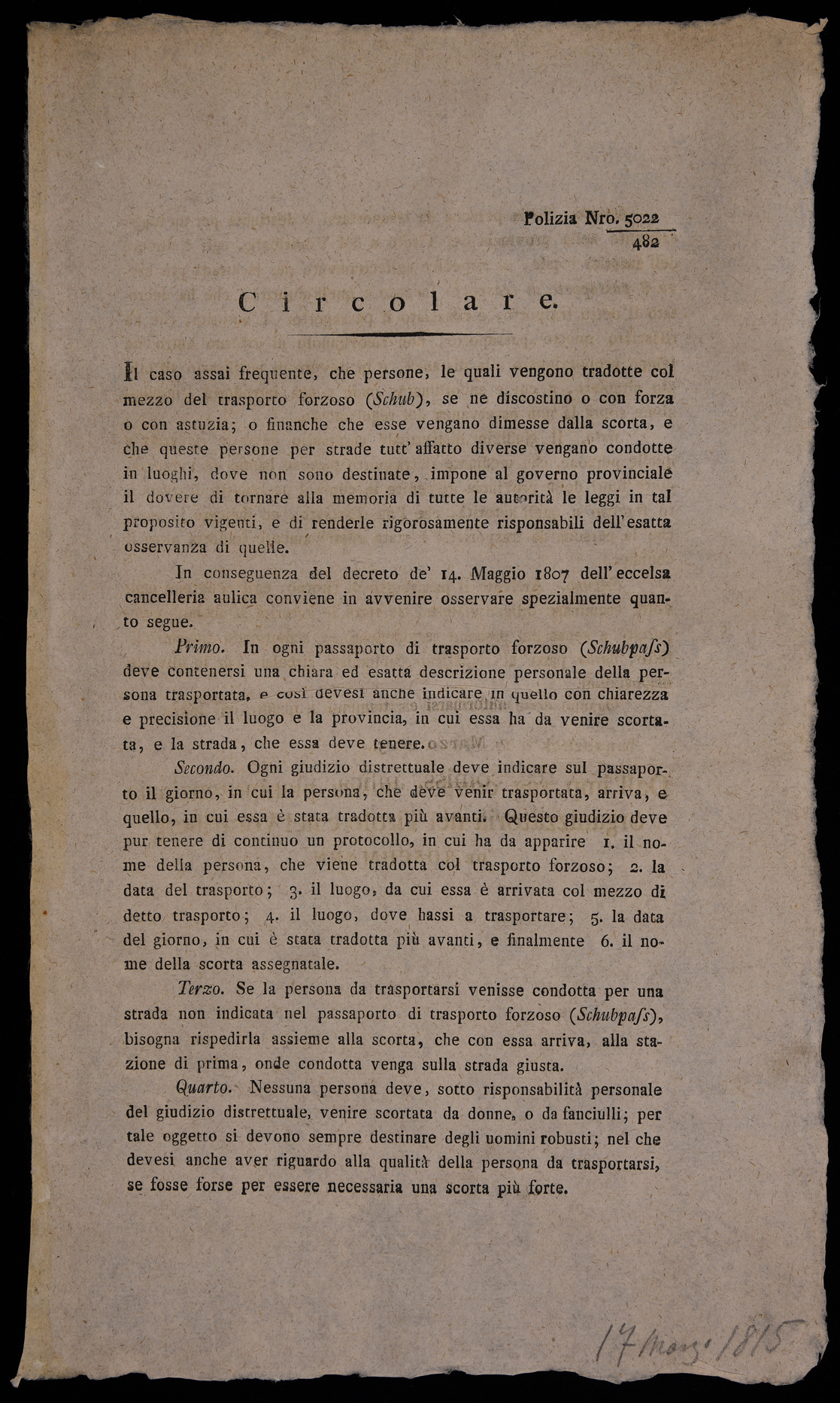 Il caso assai frequente, che persone, le quali vengono tradotte col mezzo del trasporto forzoso (Schub), se ne discostino ...