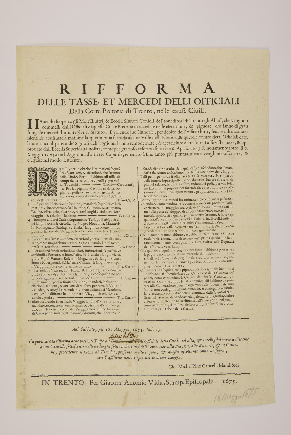 Proclama sul fisco emanato il 6 maggio 1675 dal Magistrato consolare di Trento e pubblicato il 18 maggio 1675 da Domenico Vitti, rogante Giovanni Michele Pino