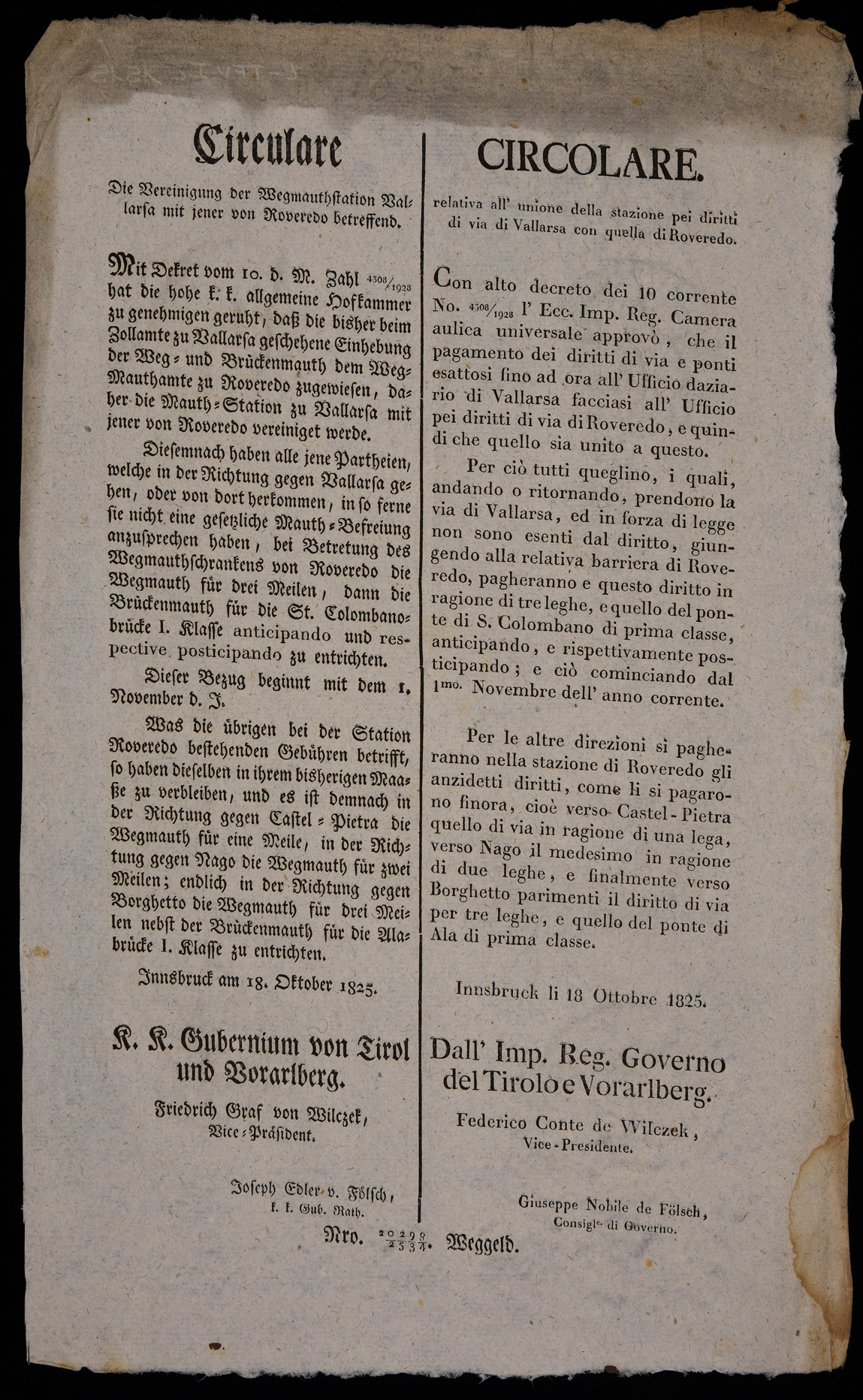 | Circulare die Vereinigung der Wegmauthstation Vallarsa mit jener von Roveredo betreffend |