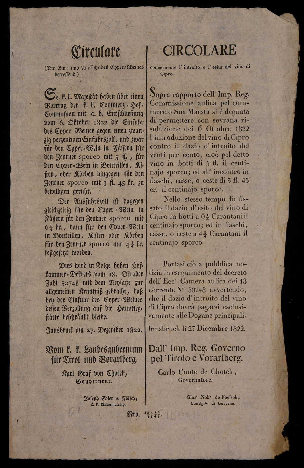 | Circulare (die Ein-und Ausfuhr des Cyper-Weines betreffend) |