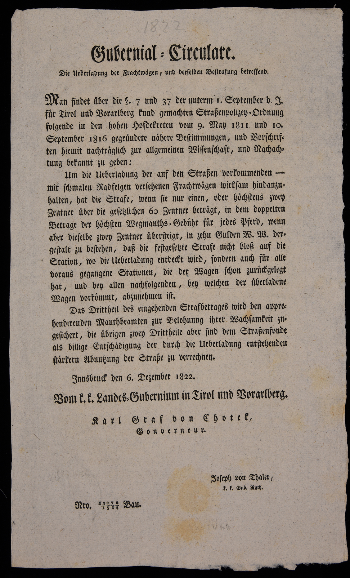 Gubernial-Circulare. Die Ueberladung der Frachtwägen, und derselben...