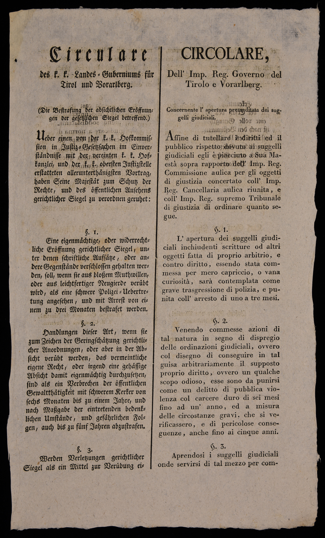 | Circolare dell'Imp. Reg. governo del Tirolo e Vorarlberg. Concernente l'apertura premeditata dei suggelli giudiciali |