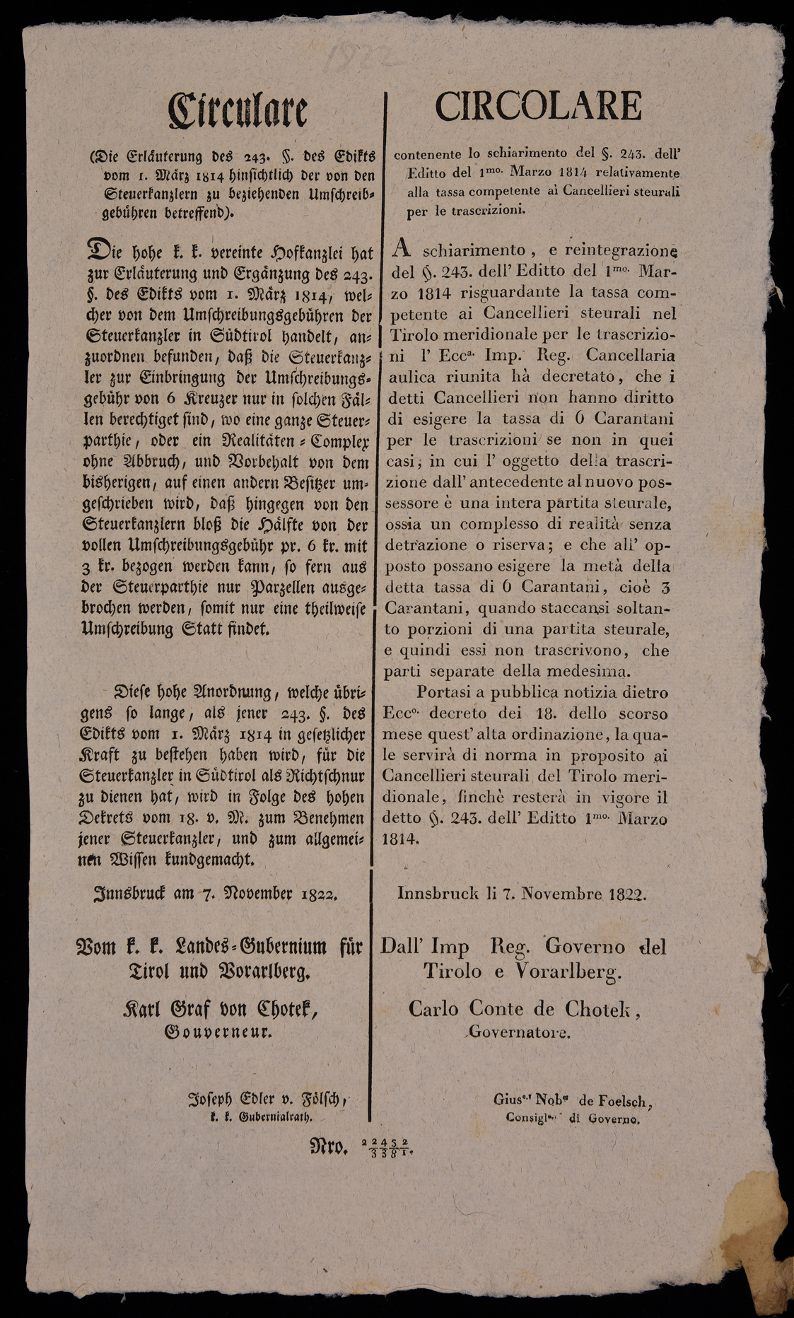 | Circolare contenente lo schiarimento del § 243. dell'editto del 1.mo marzo 1814 relativamente alla tassa competente aì cancellieri steurali per le trascrizioni |