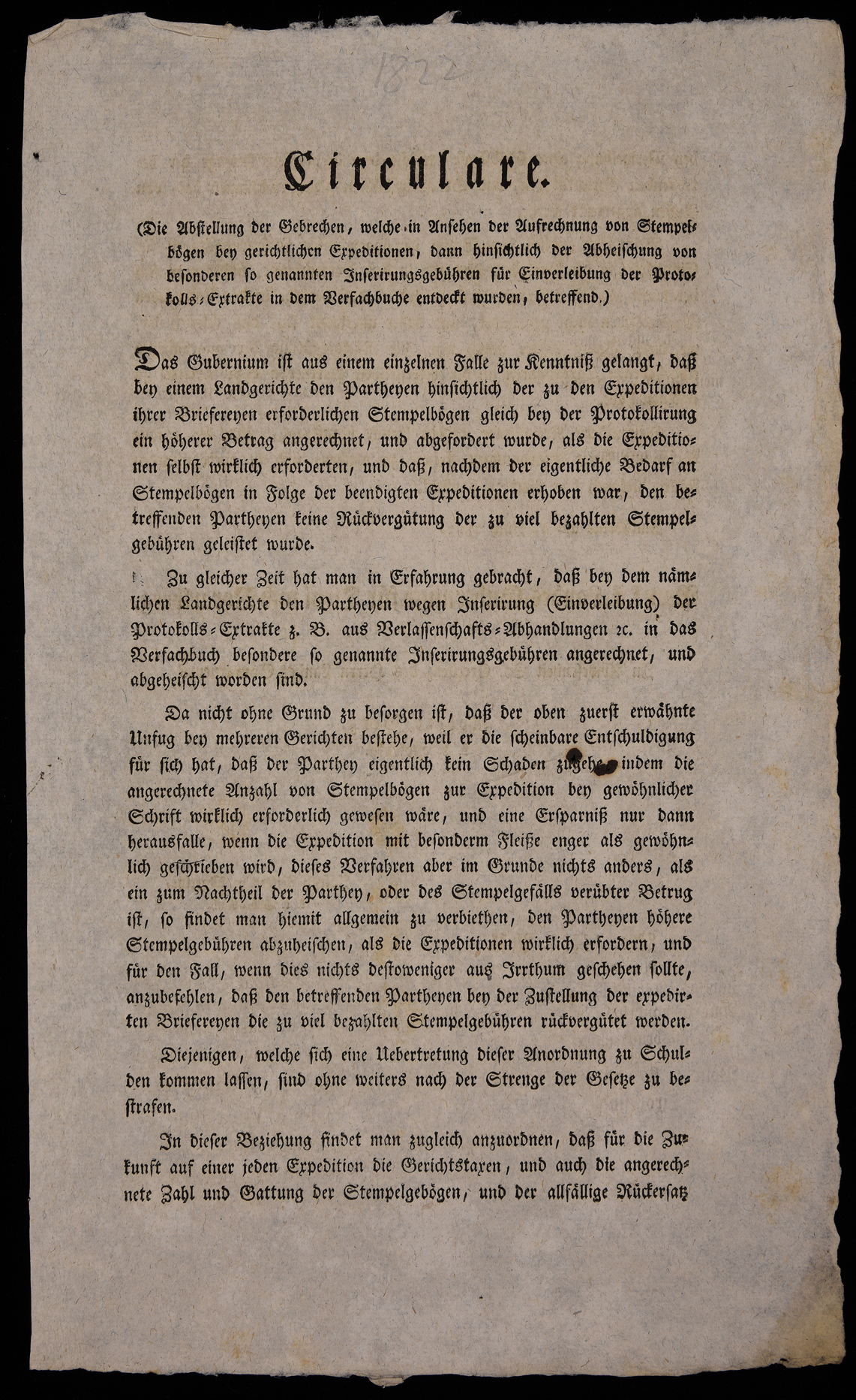 | Circulare. (Die Abstellung der Gebrechen, welche in Ansehen der Aufrechnung von Stempelbögen bey gerichtlichen Expeditionen, dann hinsichtlich der Abheischung von besonderen so genannten Inferirungsgebühren für Einverleibung der Protokolls-Extrakte in dem Berfachbuche enteckt wurden, betreffend) |