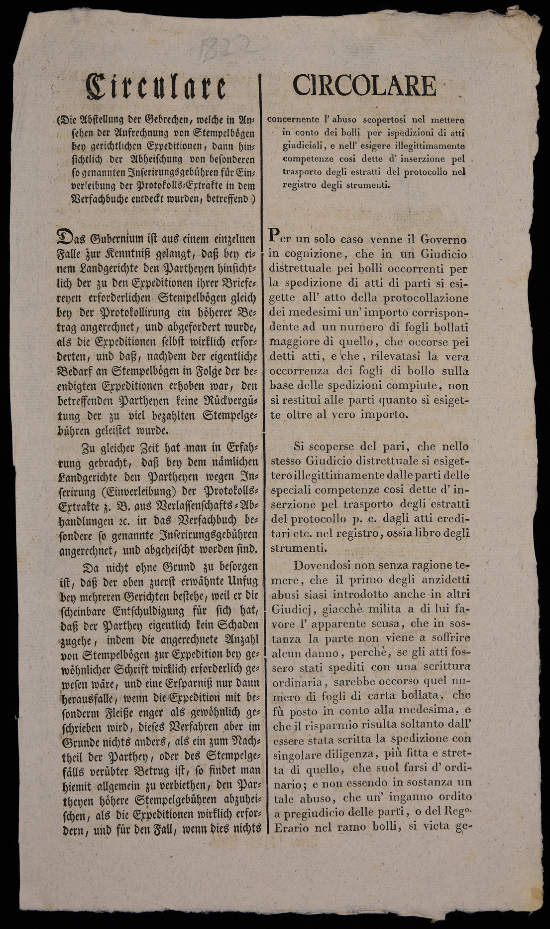 | Circulare (die Abstellung der Gebrechen, welche in Ansehen der Aufrechnung von Stempelbögen bey gerichtlichen Expeditionen, dann hinsichtlich der Abheischung von besonderen so genannten Inferirungsgebühren für Einverleibung der Protokolls-Extrakte in dem Berfachbuche entdeckt wurden, betreffend) |