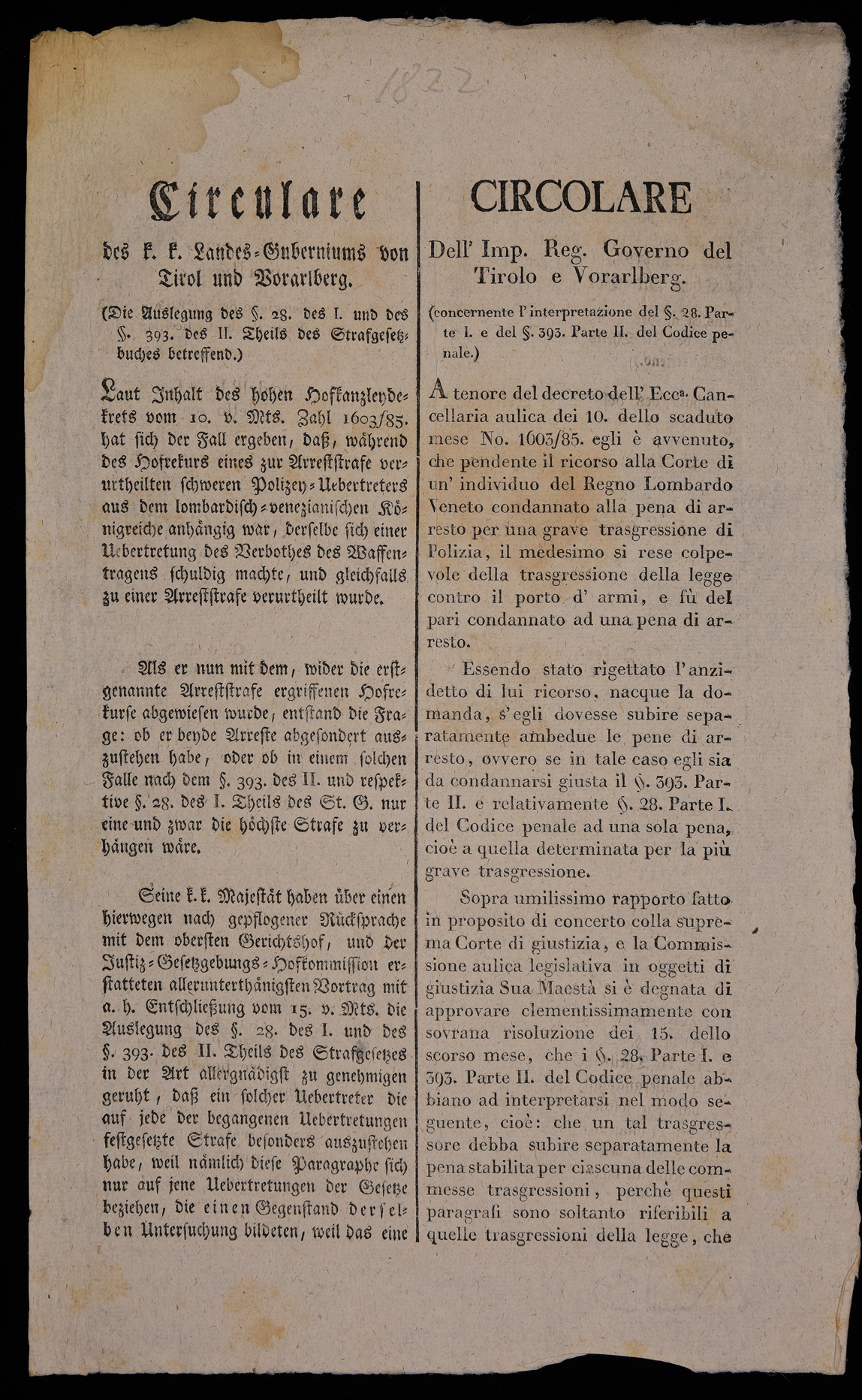 | Circolare dell'Imp. Reg. governo del Tirolo e Vorarlberg. (Concernente l'interpretazione del § 28. Parte I. e del § 393. Parte II. del Codice penale) |