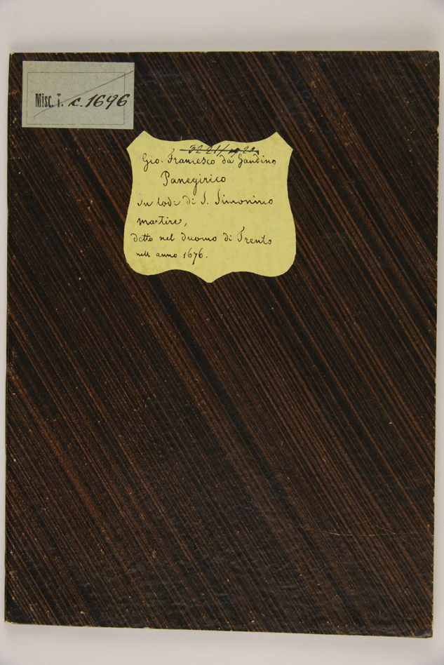 8 cc. numerate per pagina [2] 3-15 [1], 4°: A8 [$3 segnate (- A1)], bianche le cc. A1v e A8v. Carattere romano e corsivo, xilografia al frontespizio, iniziale xilografica e fregi tipografici alle cc. A2r e A3r. Licenza. Panegirico in lode di Simone da Trento pronunciato nel Duomo di Trento il giorno 24 marzo 1676 e dedicato a Liduino Piccolomini, canonico del Duomo di Trento.