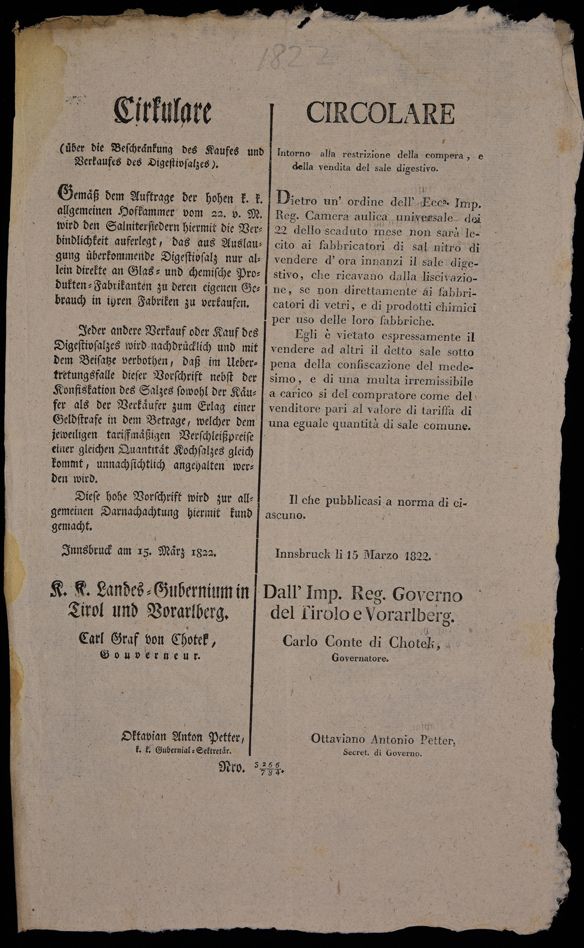 | Cirkulare (über die Beschränkung des Kaufes und Verkaufes des Digestivsalzes) |