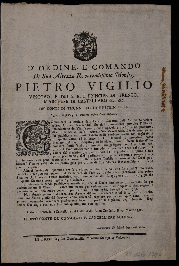 Comunicata la notizia dall'eccelso governo dell'Austria superiore a sua altezza reverendiss. che siasi nuovamente proibita l'illecita introduzione de' vini veneti ...
