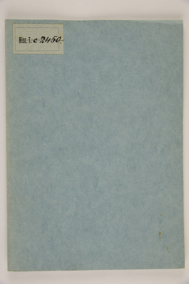Legatura in cartoncino azzurro, mm 205x145, ex libris della Biblioteca al verso del piatto anteriore, numero 21 manoscritto a matita nel margine superiore esterno, timbro della Biblioteca al frontespizio e a c. A8v, presenza di correzioni manoscritte al v. 21 del testo poetico di c. A3r che ortopedizzano la metrica. L'esemplare è malamente rifilato in alto e la numerazione delle pagine non è sempre ben individuabile, numero d'inventario P/8262 a c. A8v, antica segnatura di collocazione: Misc. T c 2450.