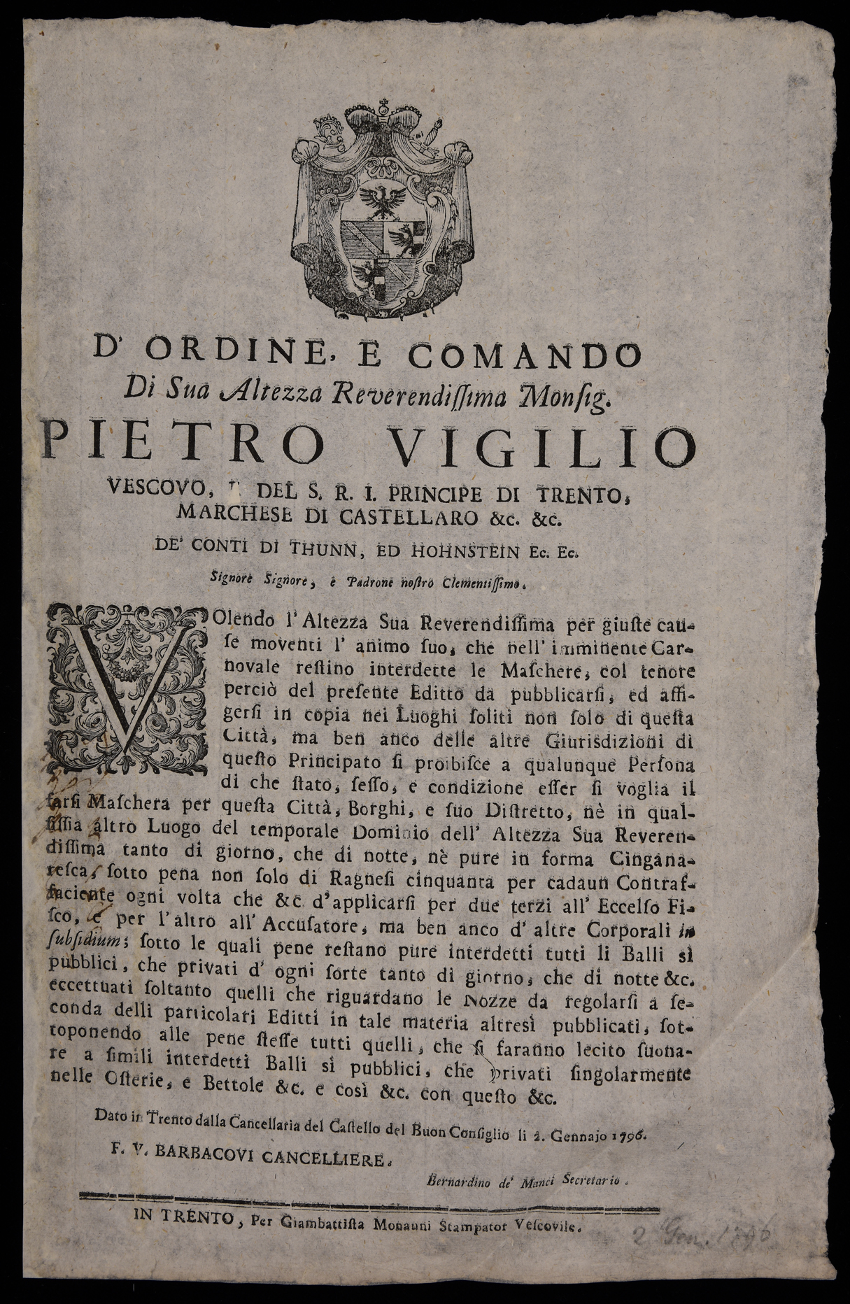 Volendo l'altezza sua reverendissima per giuste cause moventi l'animo suo, che nell'imminente carnovale restino interdette le maschere ...