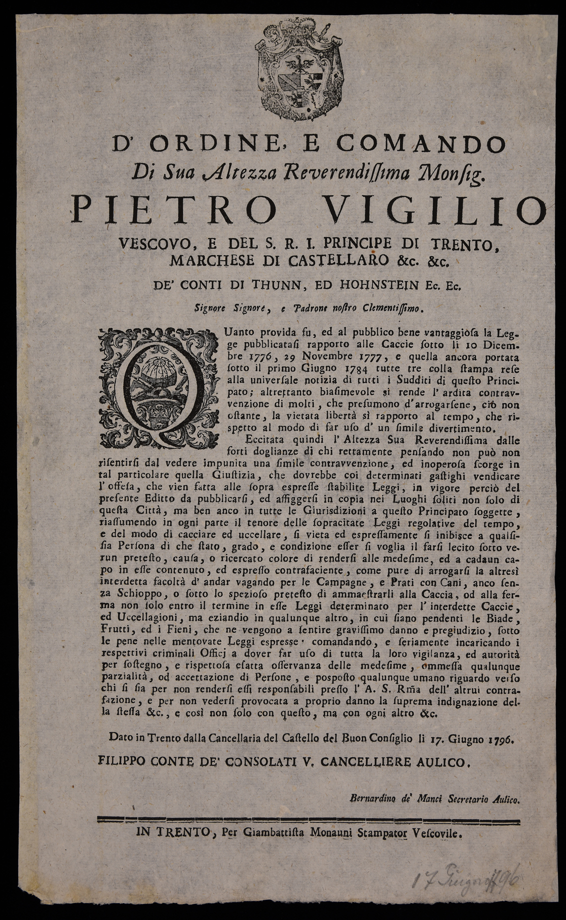 Proclama sulla caccia emanato il 17 giugno 1796 da Pietro Vigilio Thun, principe-vescovo di Trento, stemma di Pietro Vigilio Thun.