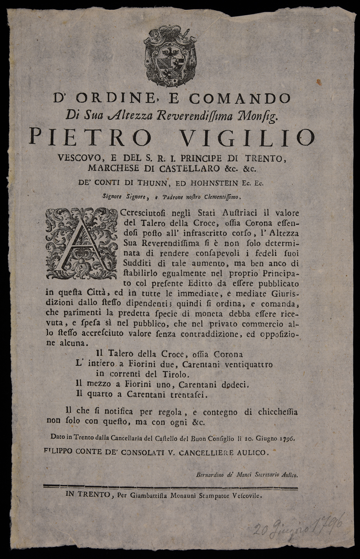 Proclama sul nuovo corso delle monete emanato il 20 giugno 1796 da Pietro Vigilio Thun, principe-vescovo di Trento, stemma di Pietro Vigilio Thun.