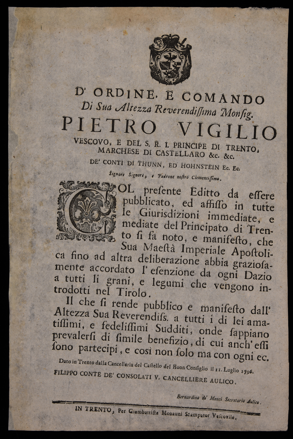 Proclama sull'esenzione del dazio per il grano e i legumi introdotti in Tirolo emanato il 11 luglio 1796 da Pietro Vigilio Thun, principe-vescovo di Trento, stemma di Pietro Vigilio Thun.