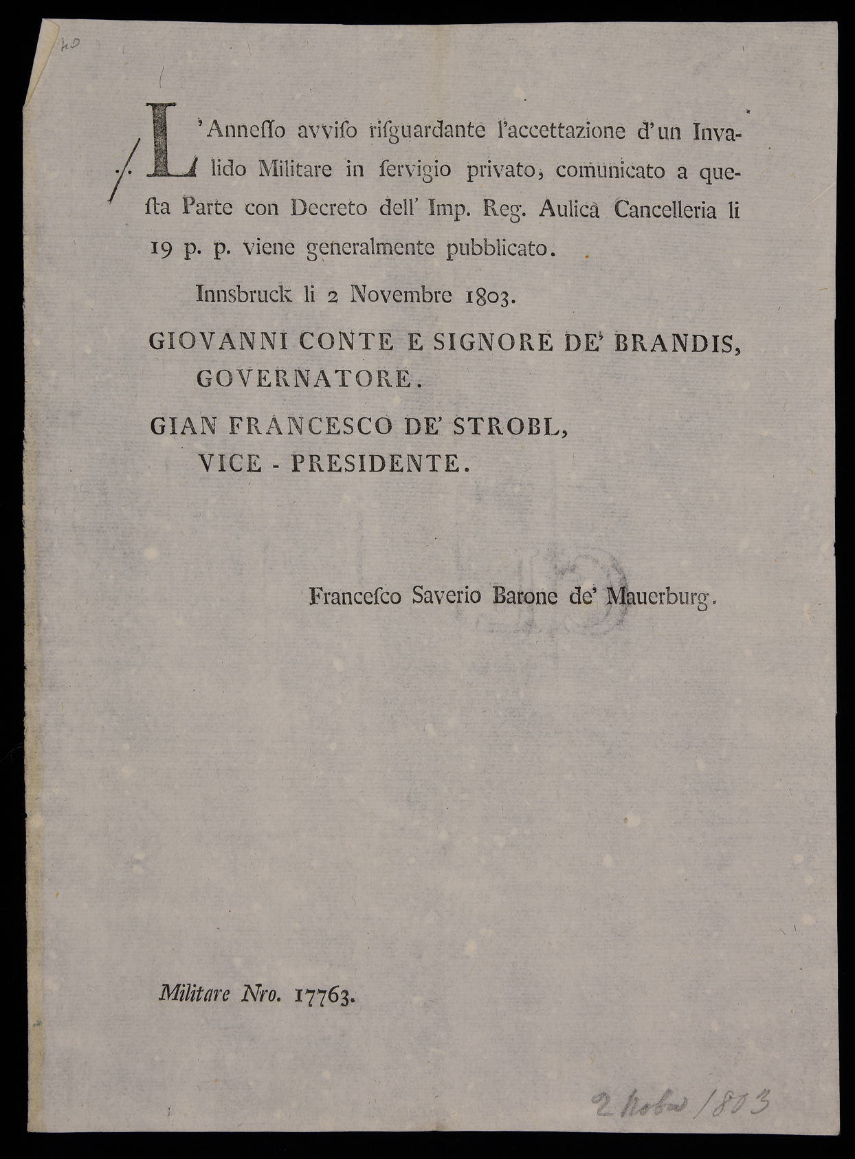 | L'annesso avviso risguardante l'accettazione d'un invalido militare in servigio privato ... |