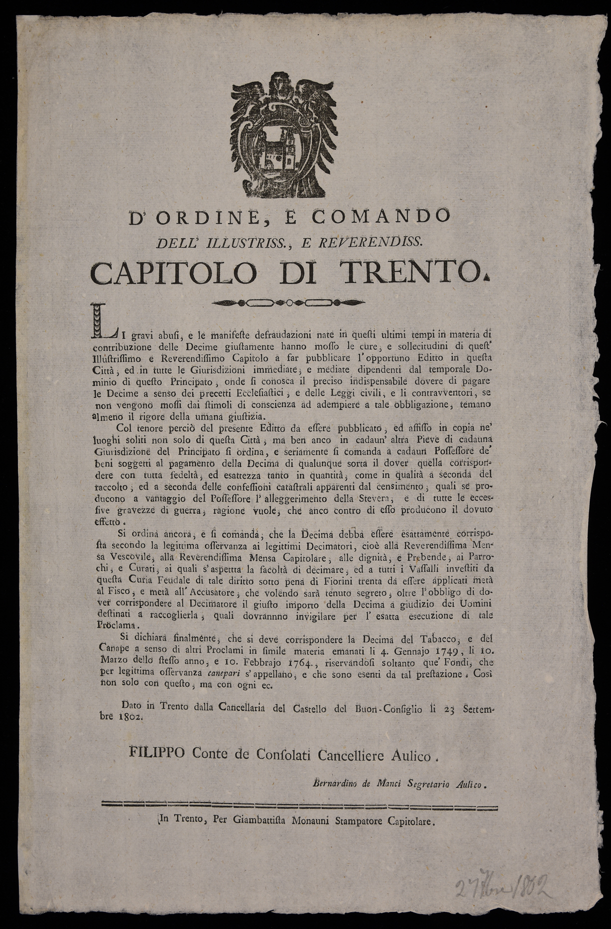 | D'ordine e comando dell'illustriss. e reverendiss. Capitolo di Trento |
