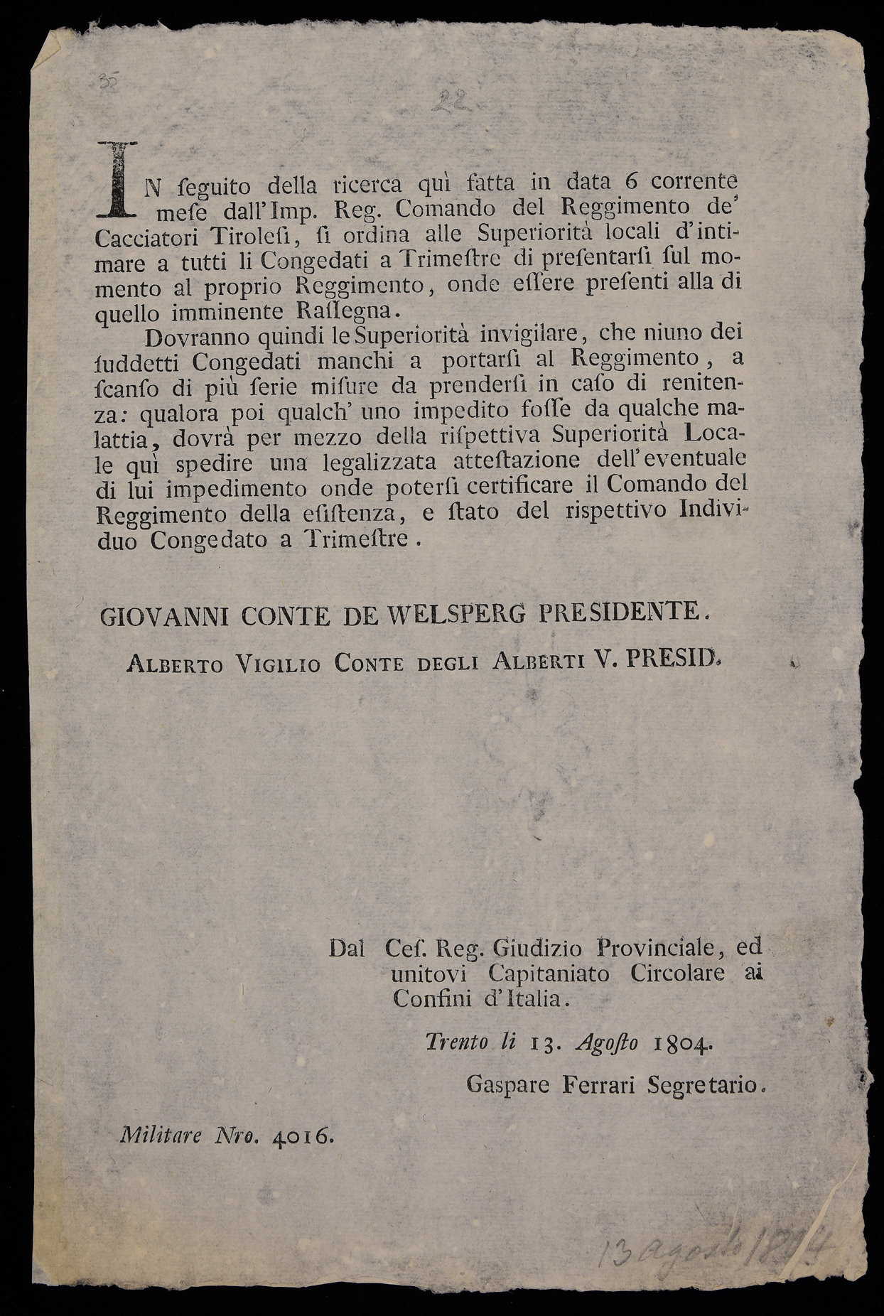 | In seguito della ricerca qui fatta in data 6 corrente mese dall'Imp. Reg. Comando del reggimento de' cacciatori tirolesi ... |