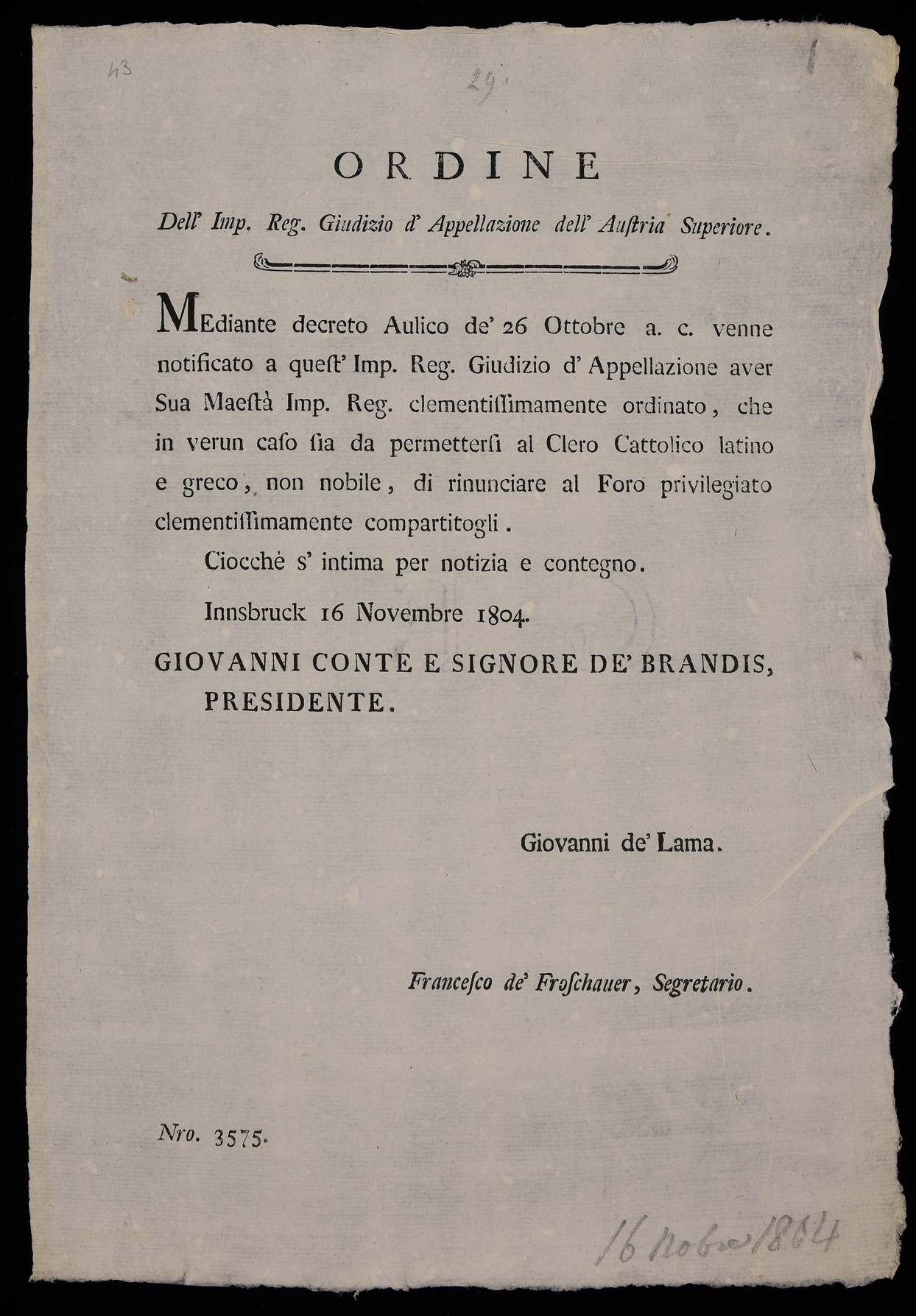 Mediante decreto aulico de' 26 ottobre a.c. venne notificato ...
