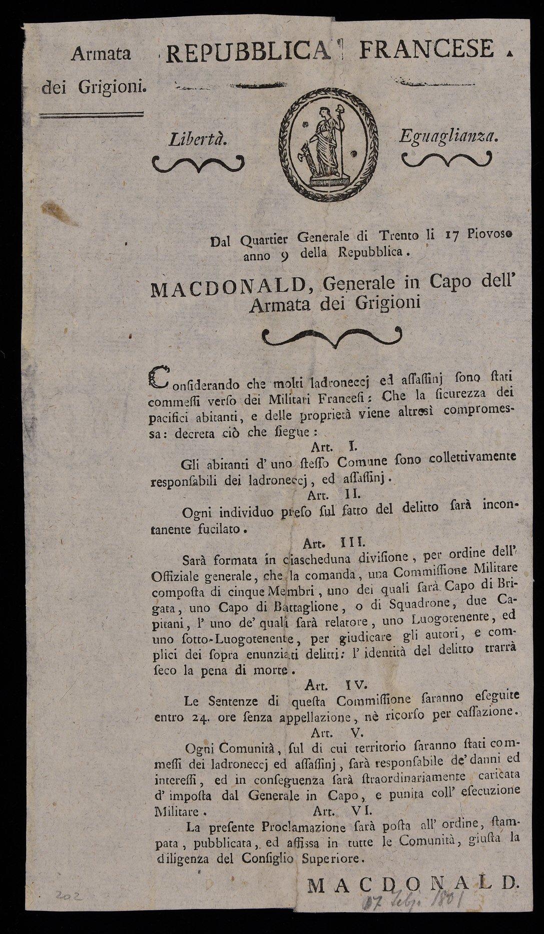 | Dal Quartier generale di Trento li 17 Piovoso anno 9 della Repubblica, Macdonald, generale in capo dell'Armata dei Grigioni |