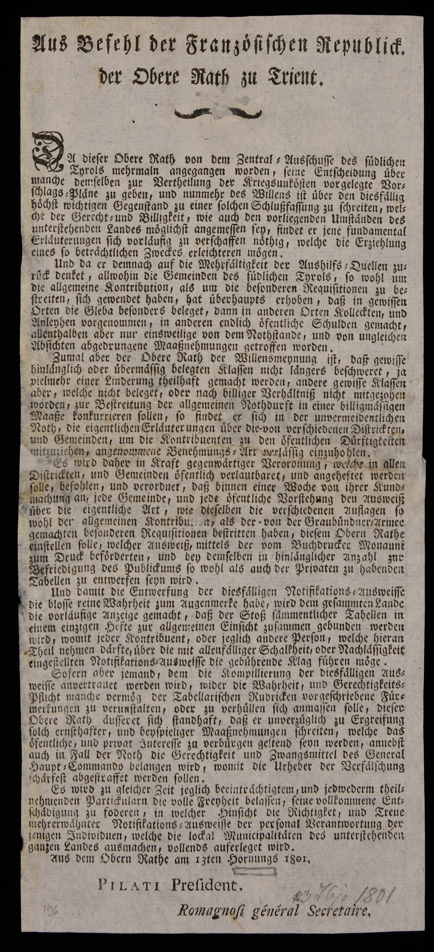 | Aus Befehl der Französischen Republick, der Obere Rath zu Trient |