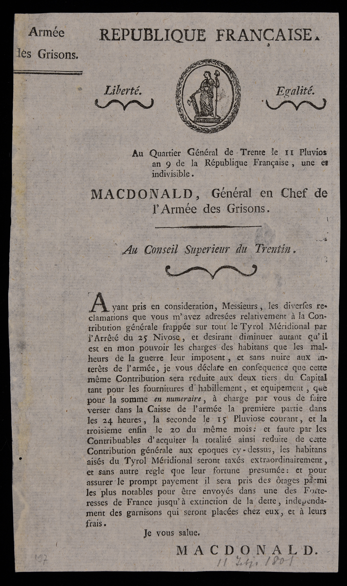| Au Quartier général de Trente le 11 Pluvios an 9 de la République Française une et indivisible. Macdonald, général en chef de l'Armée des Grisons. Au Conseil Superieur du Trentin |