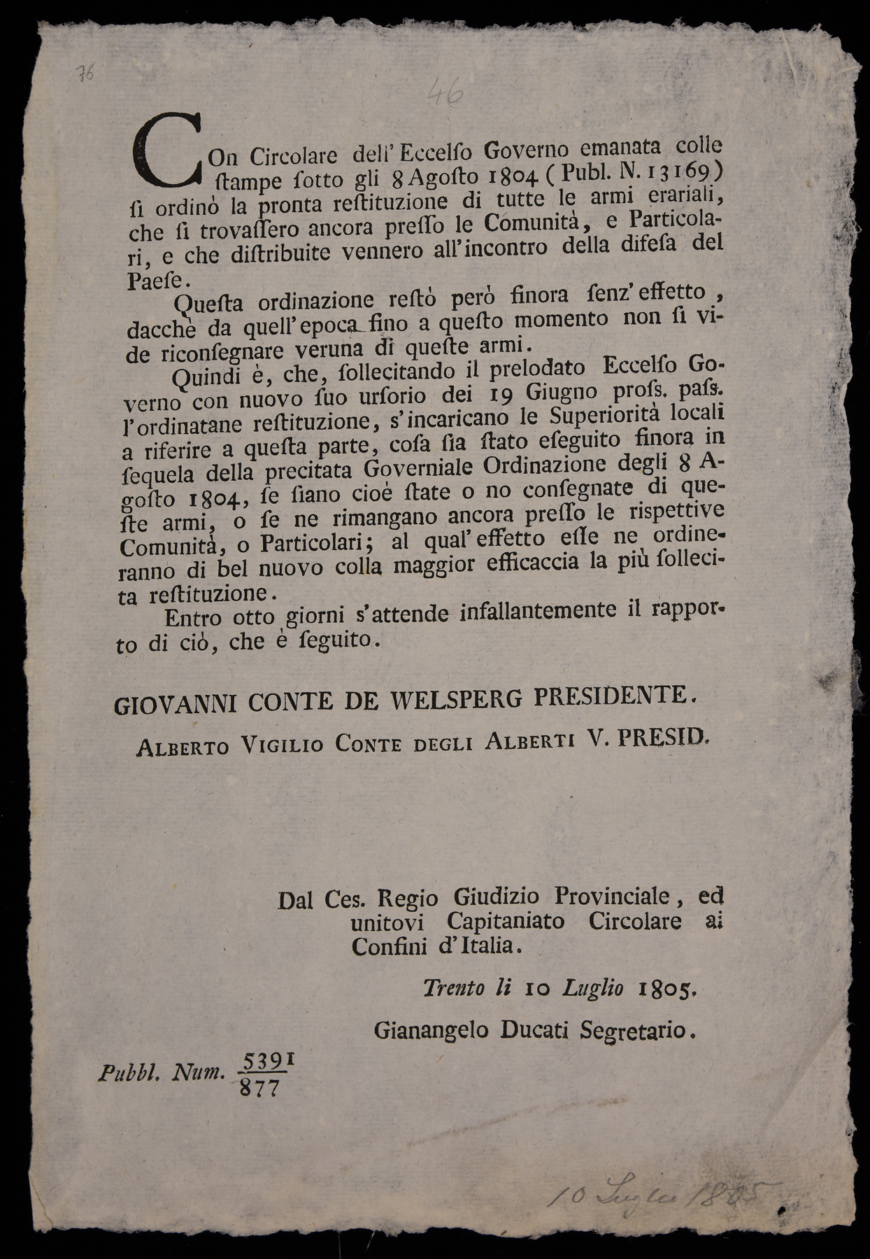 | Con circolare dell'eccelso governo emanata colle stampe sotto gli 8 agosto 1804 (publ. n. 13169) si ordinò la pronta restituzione di tutte le armi erariali ... |