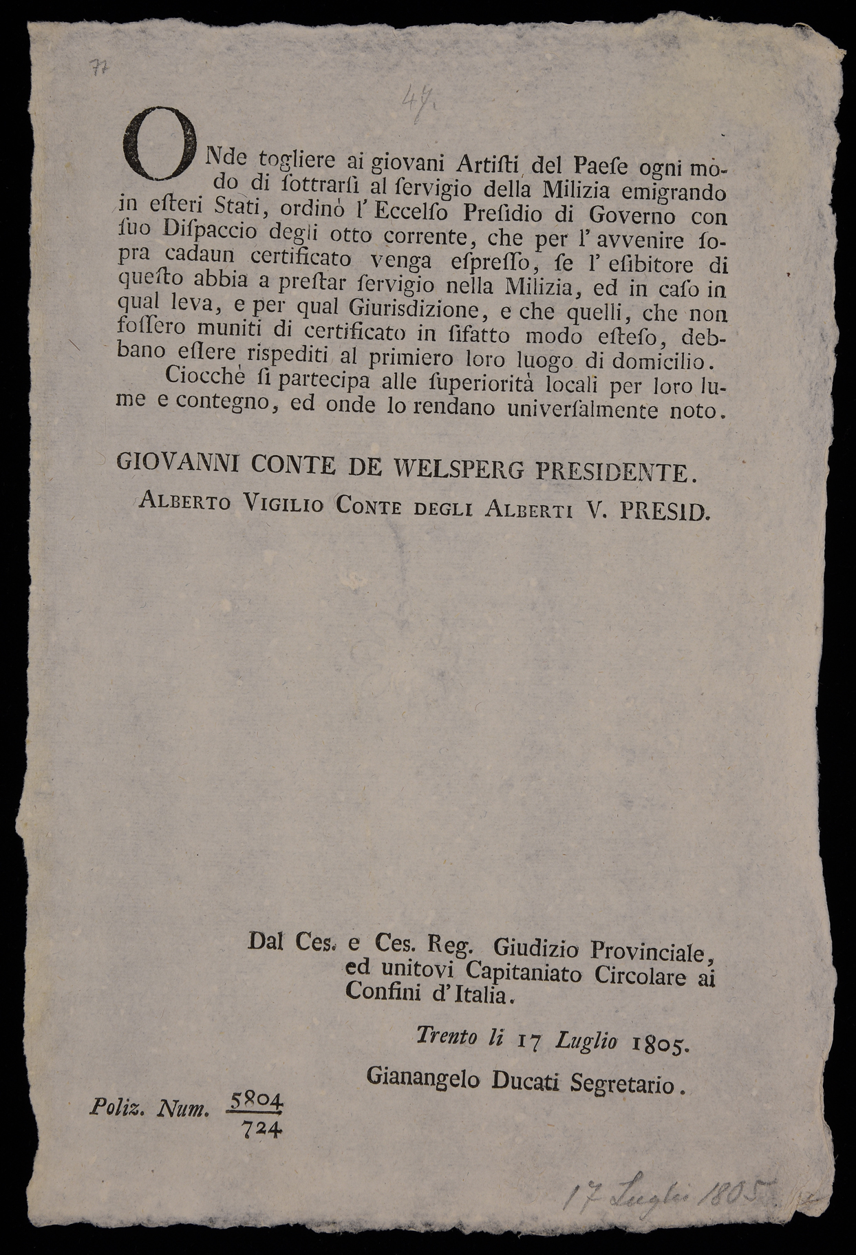| Onde togliere ai giovani artisti del paese ogni modo di sottrarsi al servigio della milizia emigrando in esteri stati ... |