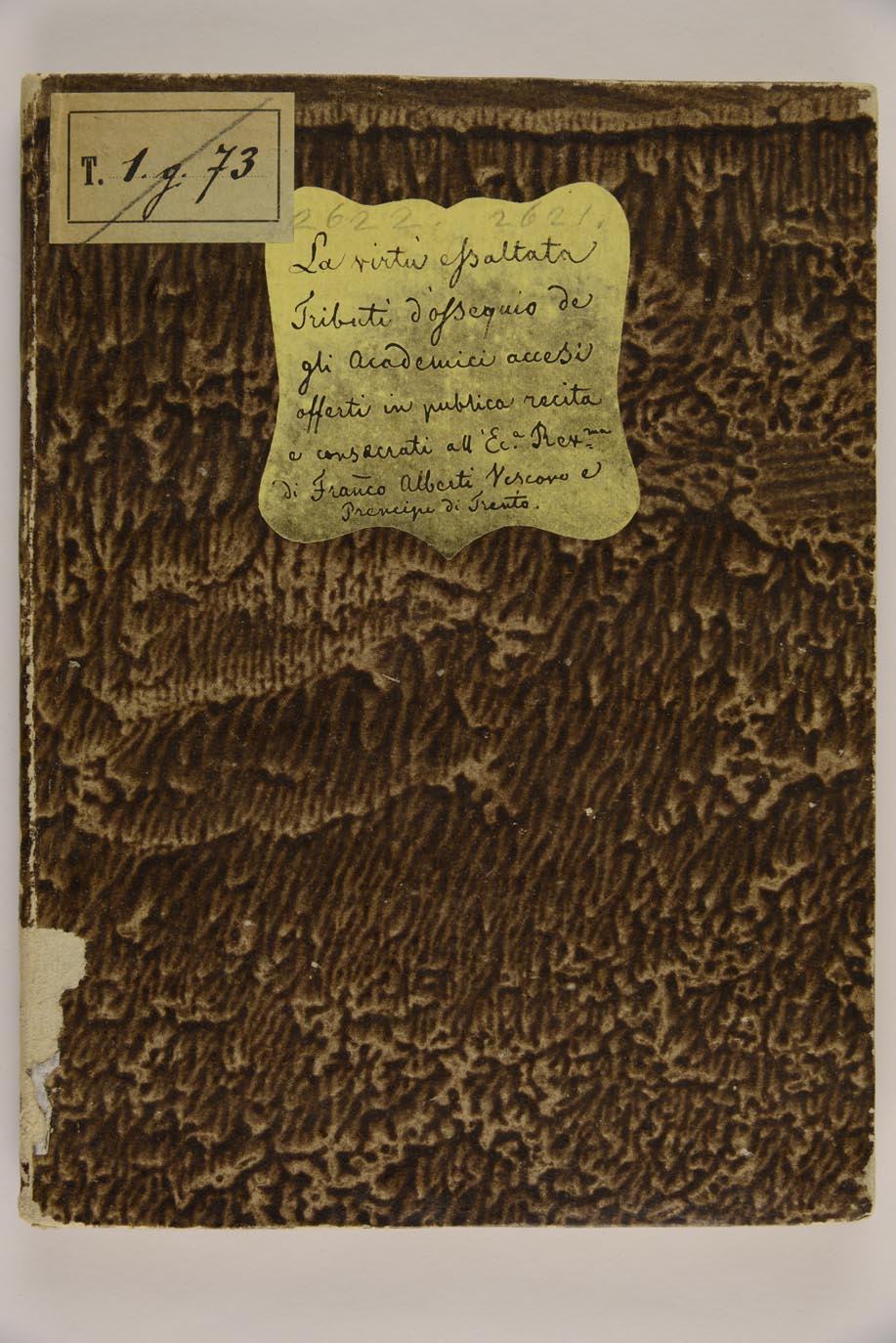 | La virtu essaltata tributi d'ossequio de gli Academici Accesi offerti in publica recita e consecrati all'eccellenza reverendiss. di monsignor Francesco Alberti vescovo e prencipe di Trento e protettore dell'Accademia |