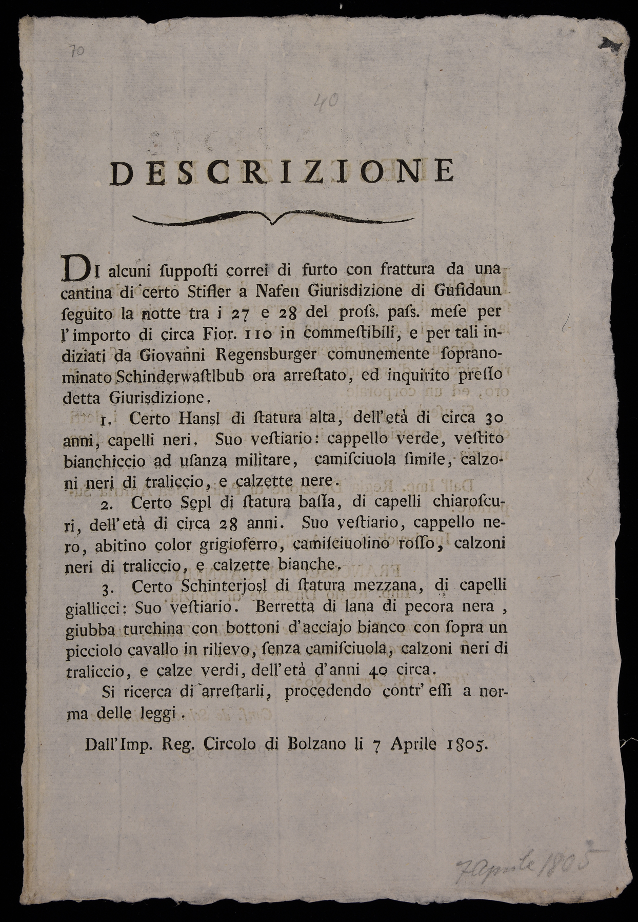 | Descrizione di alcuni supposti correi di furto con frattura da una cantina ... |