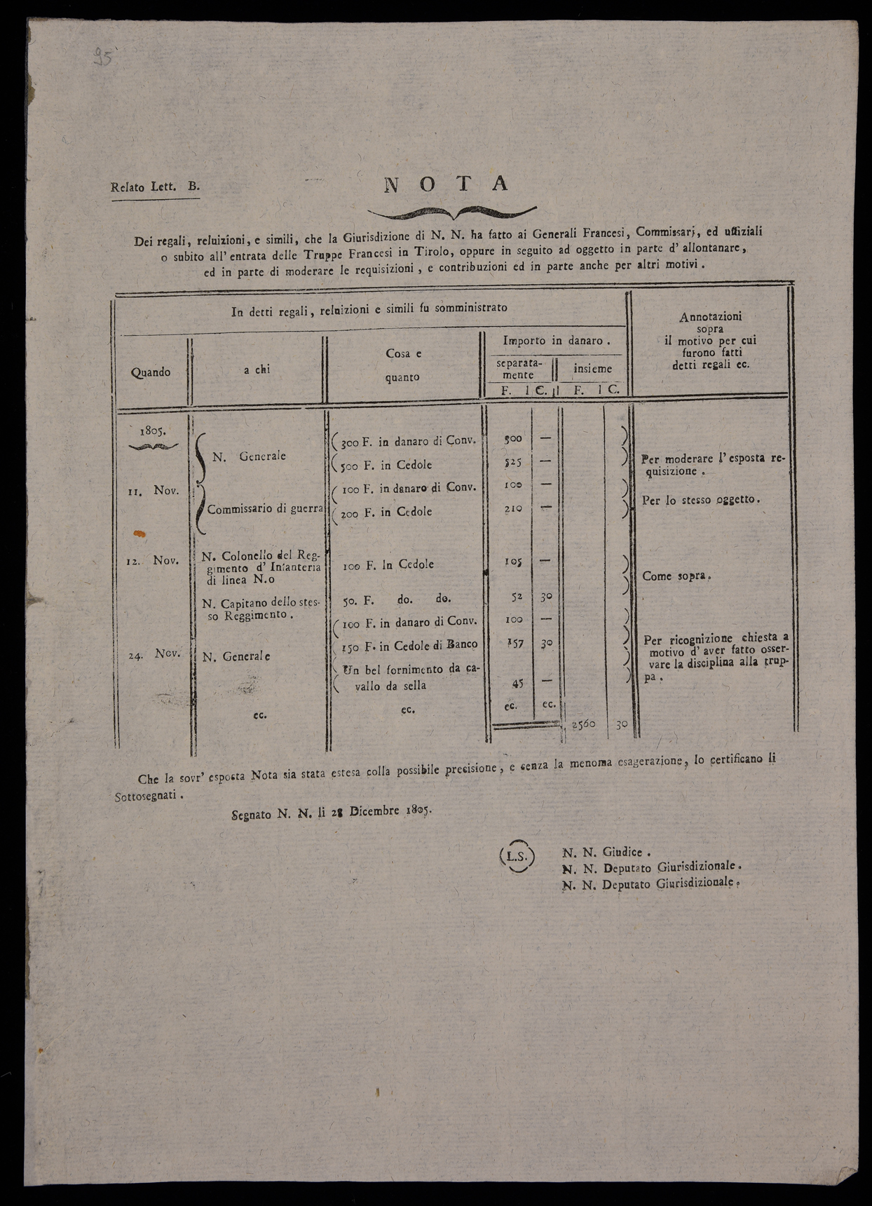 | Nota dei regali, reluizioni e simili che la giurisdizione di N.N. ha fatto ai generali francesi, commissari ed uffiziali ... |