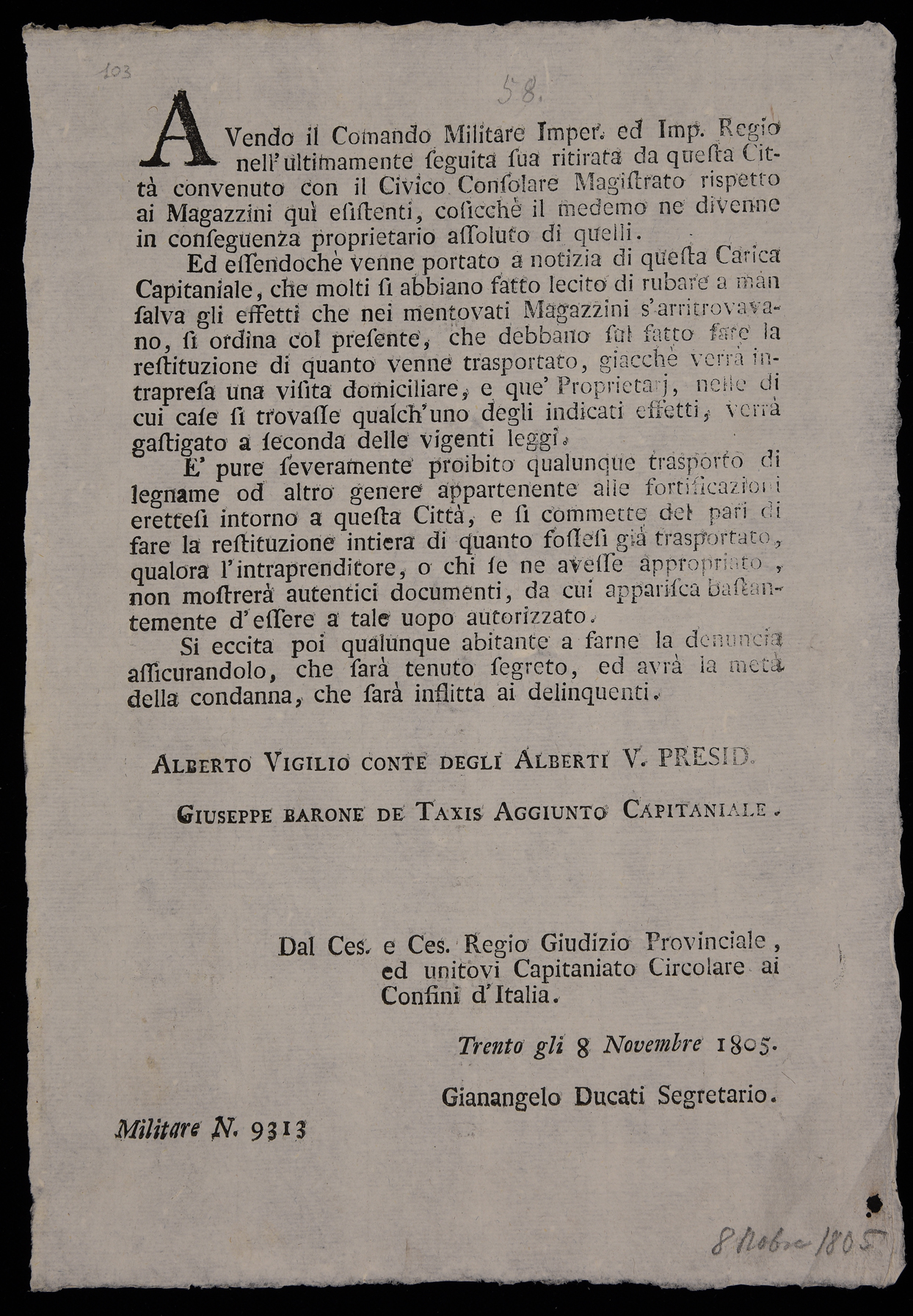 | Avendo il comando militare imper. ed imp. regio nell'ultimamente seguita sua ritirata da questa città convenuto con il civico consolare magistrato rispetto ai magazzini quì esistenti ... |