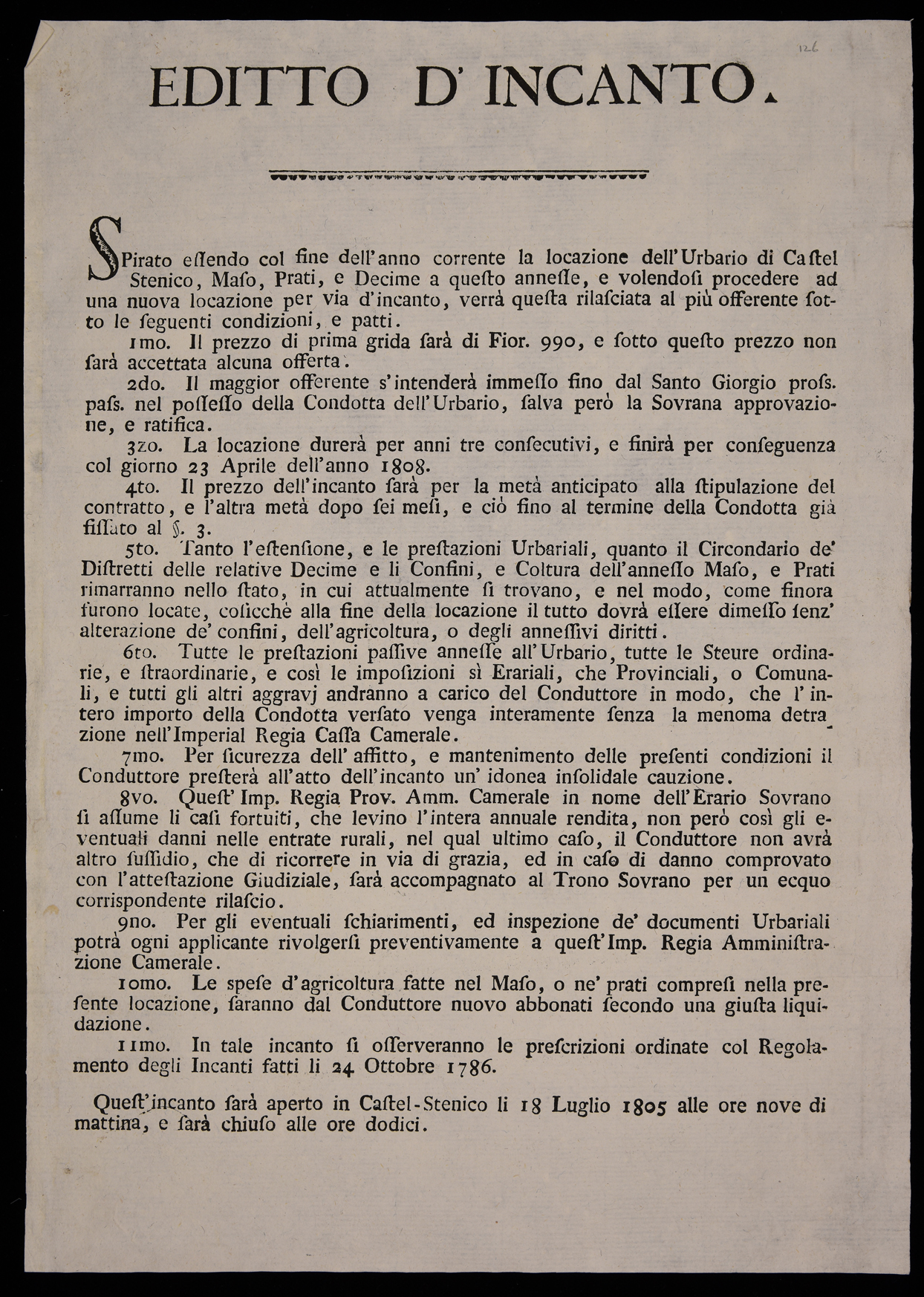 Spirato essendo col fine dell'anno corrente la locazione dell'urbario di Castel Stenico ...