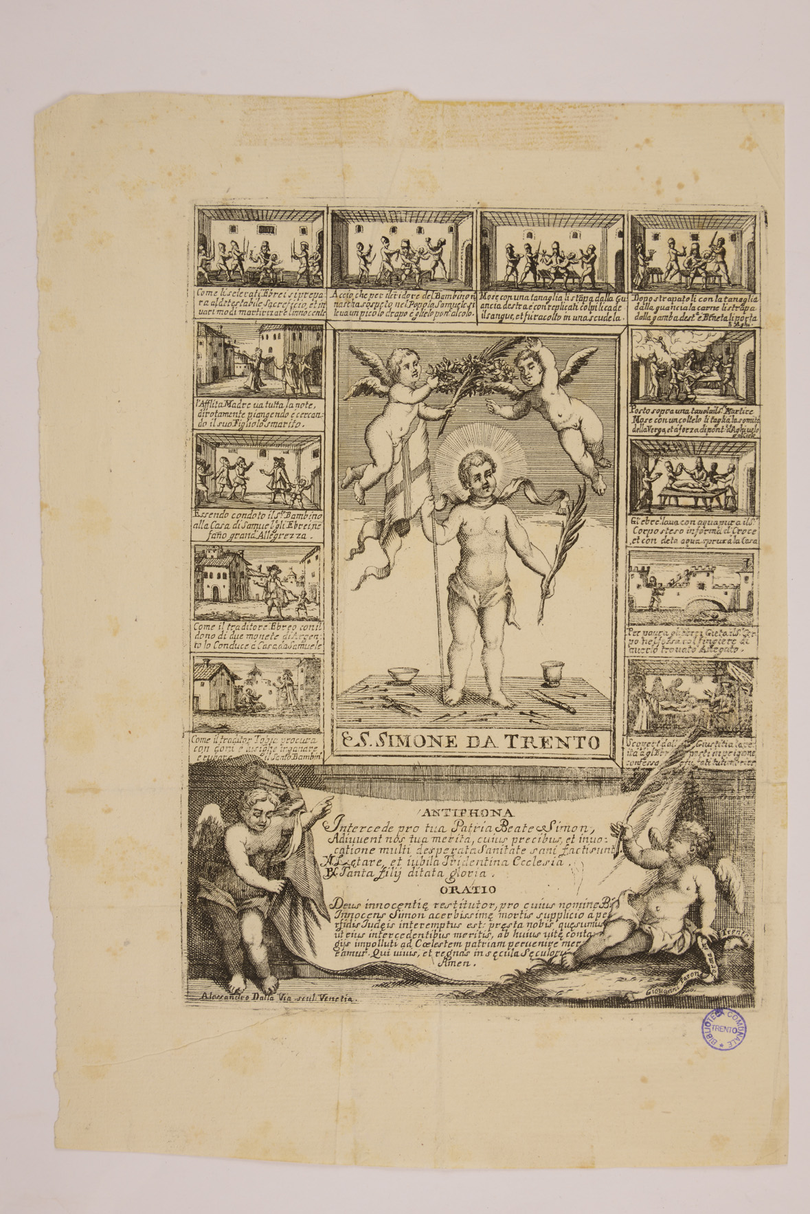 Data di stampa dagli estremi cronologici di attività della tipografia di Giovanni Parone. Esiste un'altra emissione della stessa opera pubblicata da Simone Girolamo Battisti (cfr. ESTER ID 12332). 12 illustrazioni con la pseudo-ricostruzione della morte di Simone da Trento (le immagini vanno lette in senso antiorario, a partire da quella in basso a sinistra), accompagnate ciascuna da una didascalia in italiano, attorno a una illustrazione centrale e, in calce, il testo di una antifona e di una preghiera in latino